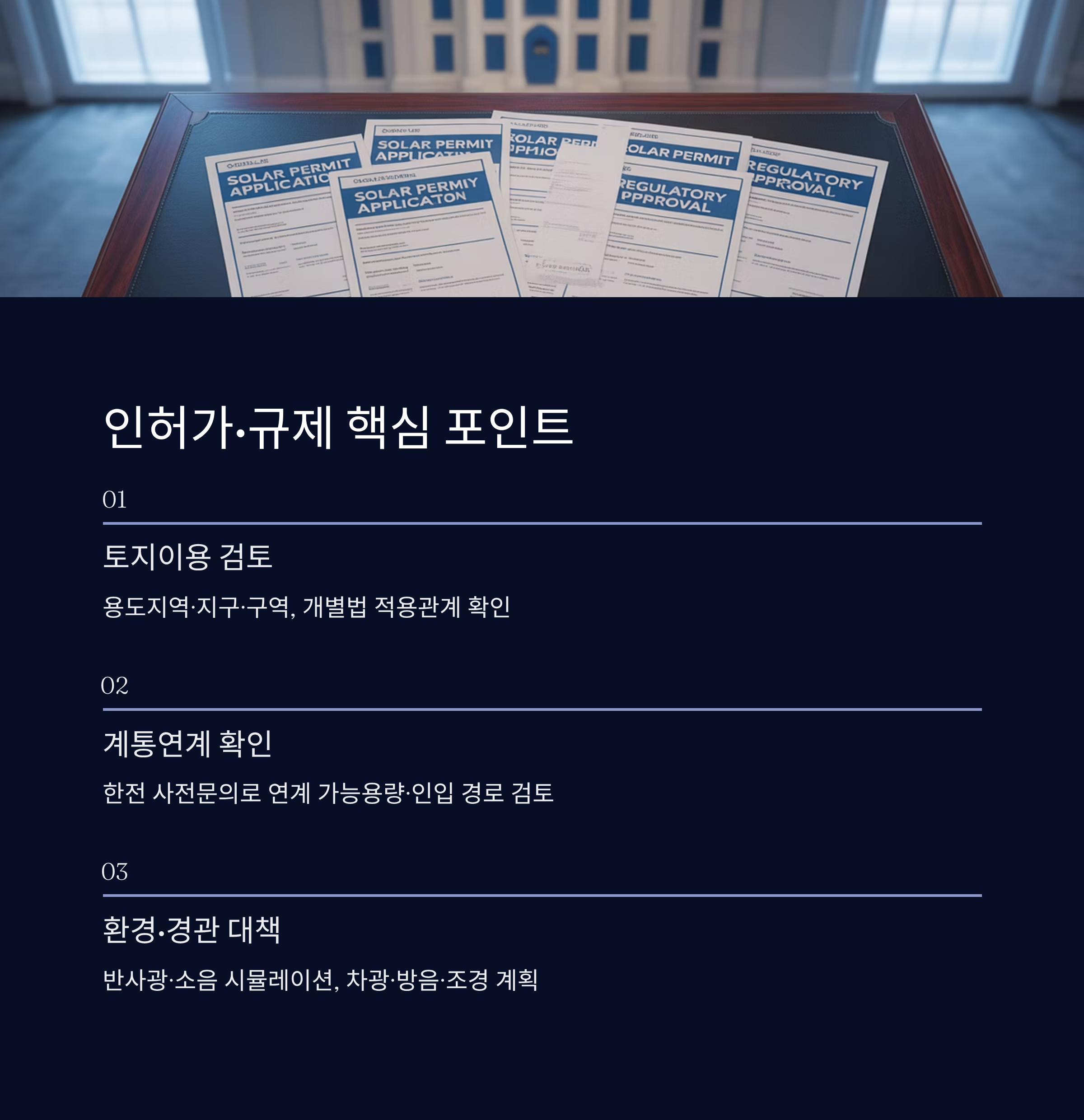 계통은 한전에 사전문의를 통해 연계 가능용량·인입 경로·보호계전 계획을 확인해요. 고압 이상 연계 시 책임분계점, 피뢰·접지, 역률·무효전력 제어 기준을 충족해야 하고, ESS 포함 시 충·방전 운영계획과 화재안전 기준을 명확히 해두면 행정 신뢰도가 올라가요.