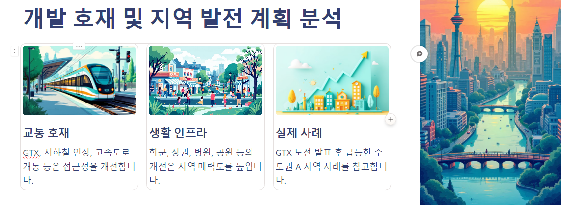 학군, 상권, 병원, 공원 등의 생활 인프라가 꾸준히 개선되고 있는 지역은 가치 상승의 잠재력이 큽니다. 특히 대형 마트, 복합 쇼핑몰 등의 개발 계획은 지역 매력도를 크게 높이는 요인입니다.