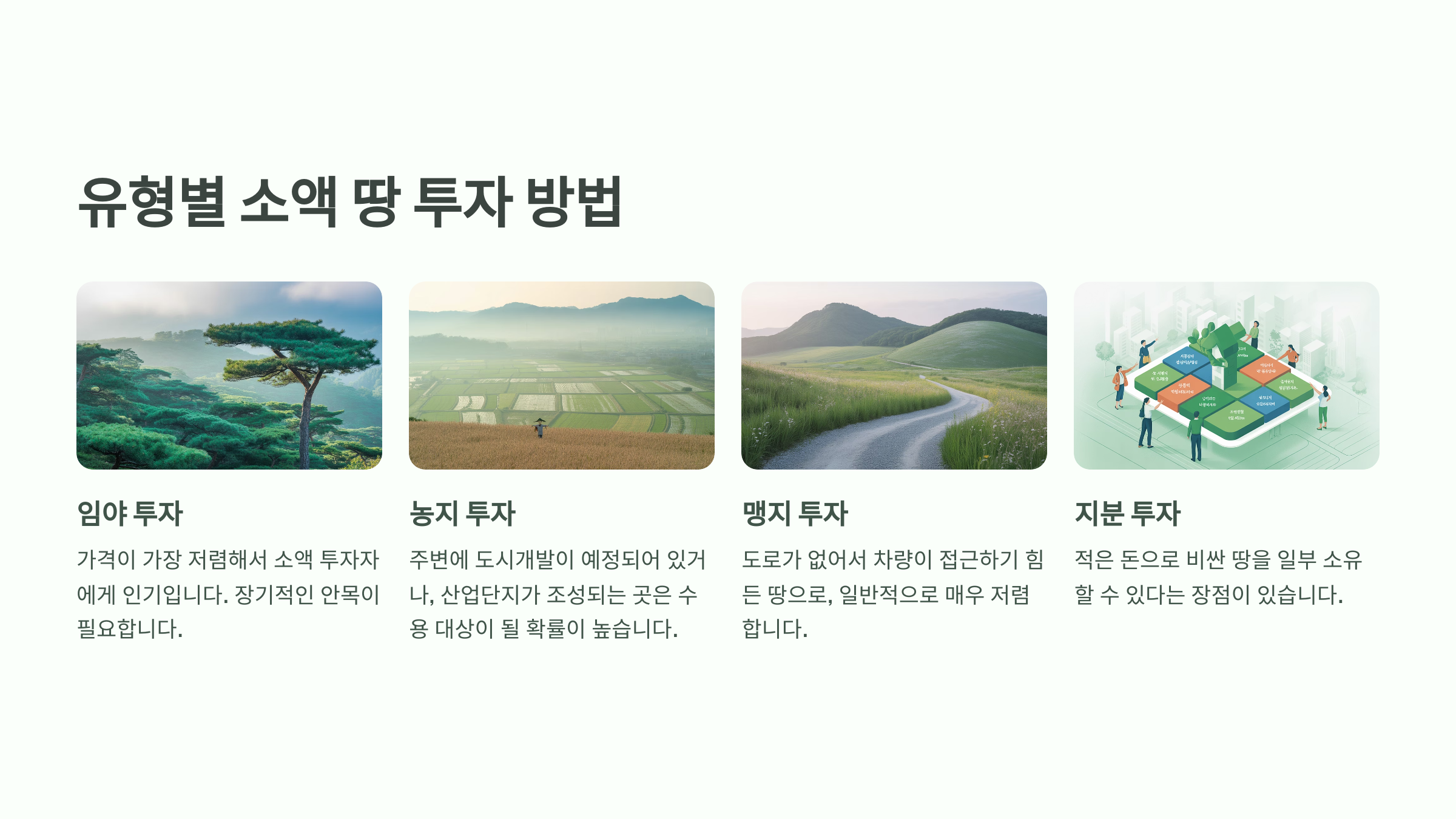 이제 땅 투자에서 중요한 ‘시기’와 ‘전략’을 알게 되었죠? 다음은 어떤 ‘유형’의 땅에 소액 투자가 가능한지 자세히 알아볼게요. 🧭