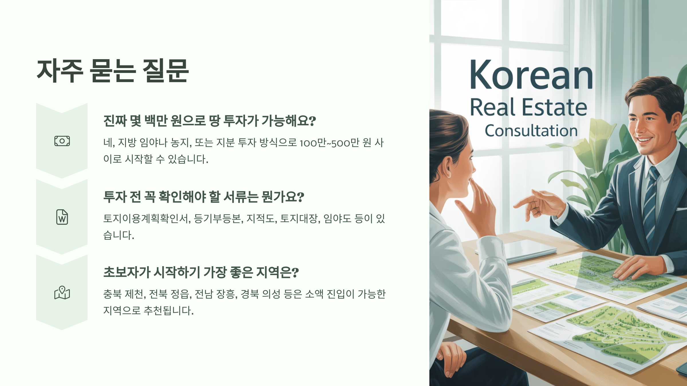 이제 전체 흐름을 파악하셨다면, 마지막으로 땅 투자 관련해서 자주 묻는 질문들을 정리해볼게요! FAQ 코너에서 중요한 포인트를 다시 한번 복습해보세요. 💡