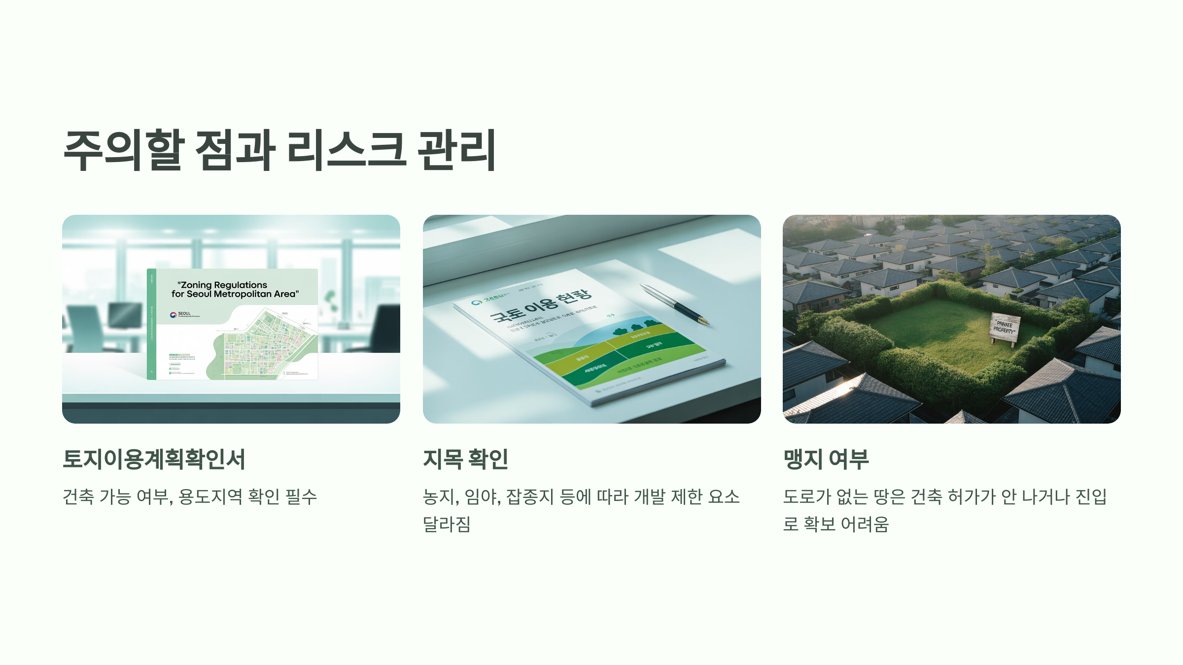 소액으로 땅 투자를 시작하는 사람들에게 가장 무서운 건 '몰라서 당하는 손해'예요. 땅은 건물보다 정보가 적고, 변수가 많아서 실수를 하면 회복하기 어려운 경우가 많아요. 그래서 투자 전 반드시 체크해야 할 주의사항들을 꼼꼼히 정리해볼게요.
