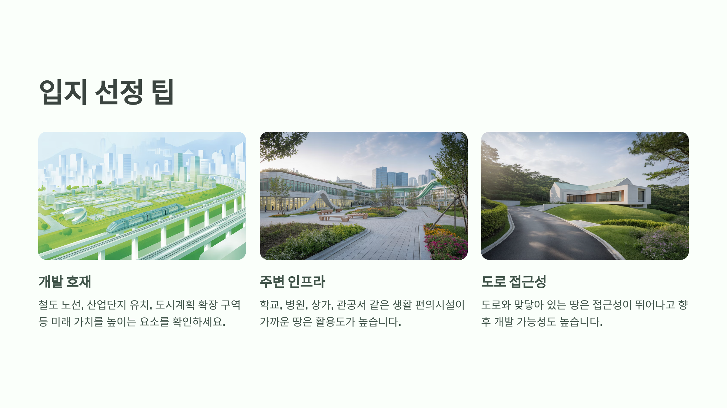 입지 선정은 땅 투자에서 가장 중요한 요소 중 하나예요. 아무리 싼 땅이라도 입지가 나쁘면 되팔기 어렵고, 반대로 입지가 좋으면 시간이 지날수록 가치가 자연스럽게 올라가요. 소액 투자일수록 더욱 입지를 정확히 보는 눈이 필요하답니다.