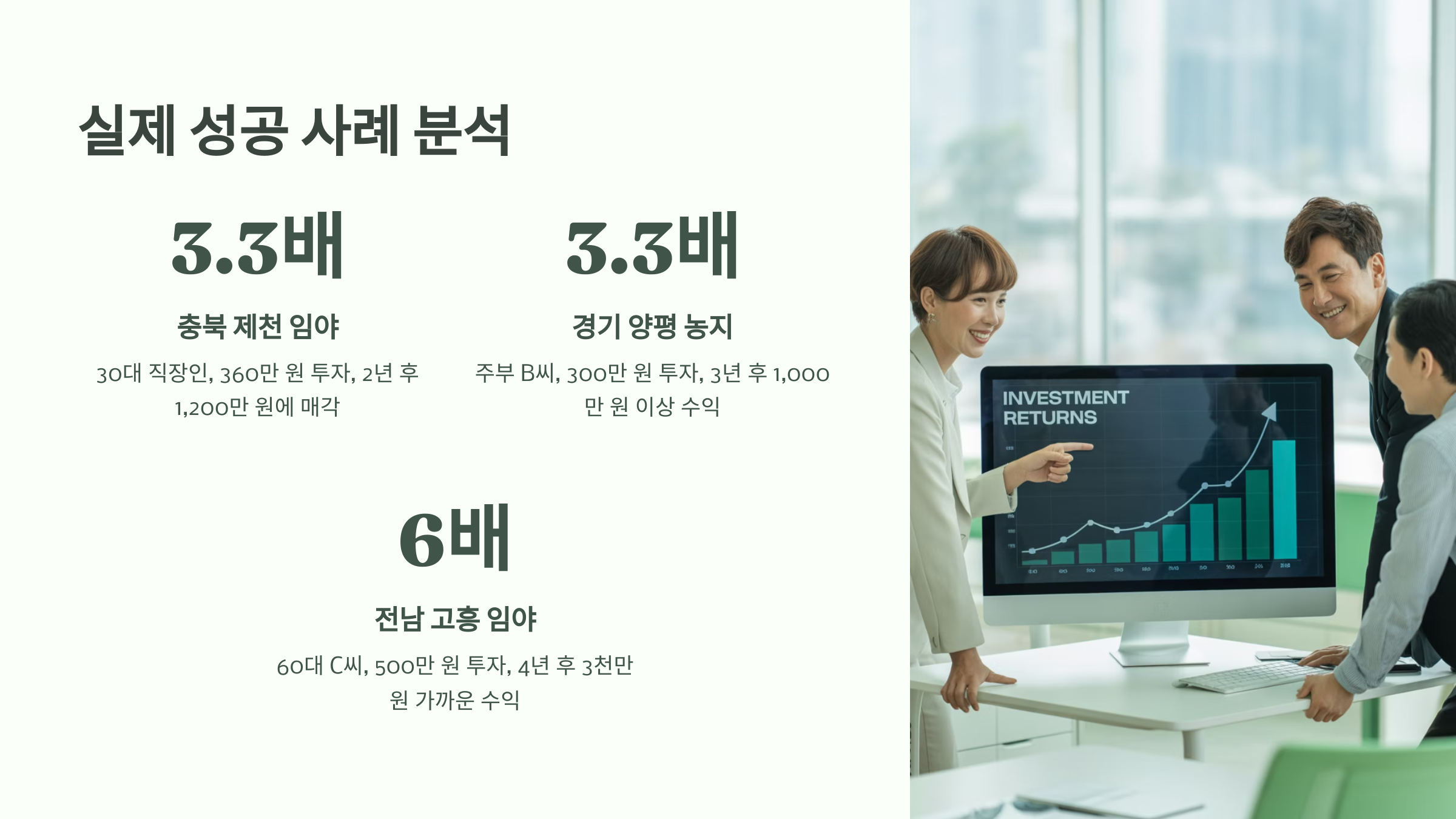 세 번째는 은퇴를 앞둔 60대 C씨의 이야기예요. 그는 전남 고흥에 위치한 공유지 형태의 임야를 지인들과 함께 지분으로 매입했어요. 당시에는 수익성에 대한 기대가 낮았지만, 몇 년 후 태양광 발전소 부지로 지정되면서 지가가 5배 이상 상승했어요. 500만 원의 초기 투자로 약 3천만 원 가까운 수익을 얻었어요.