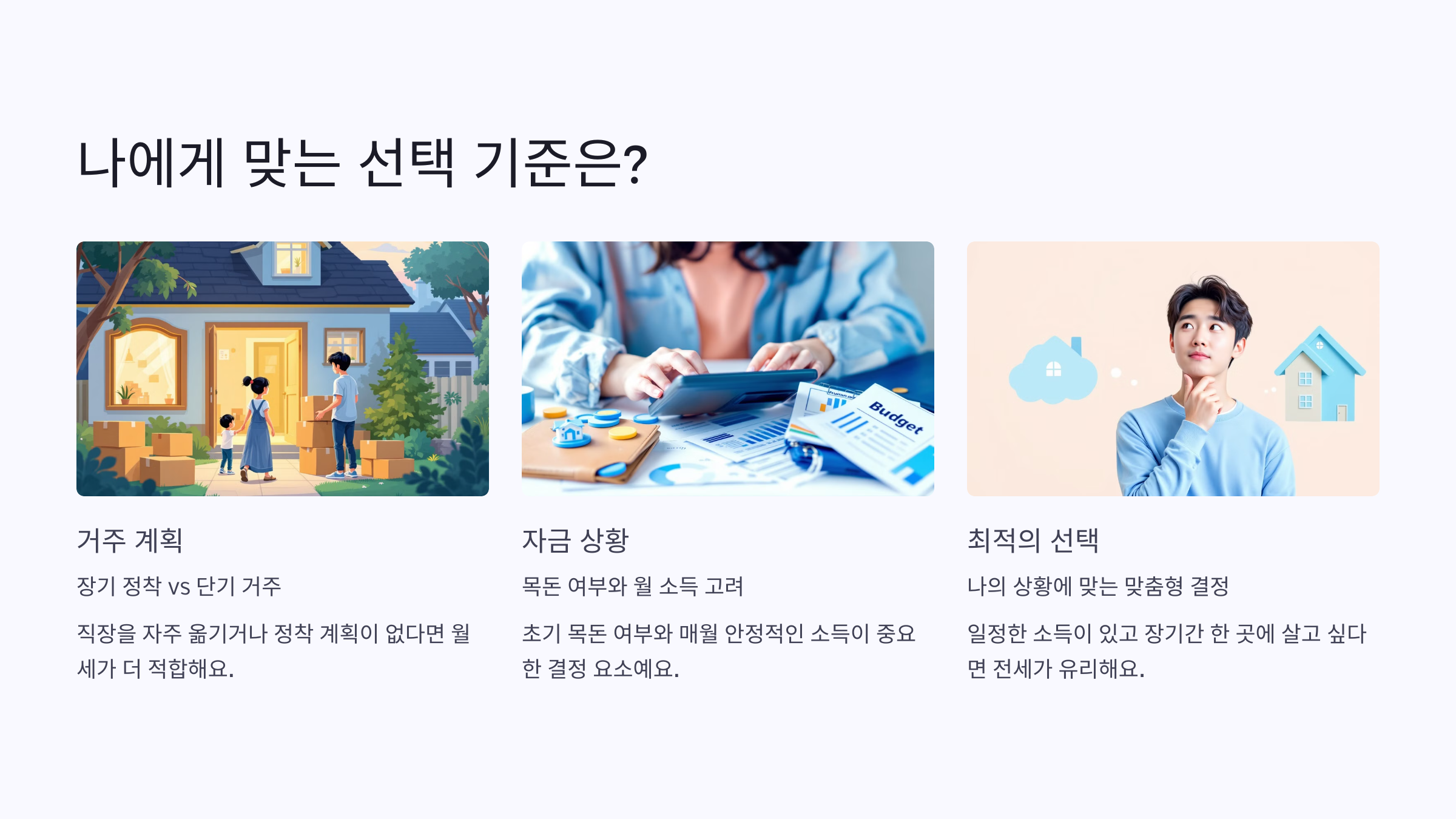 이제 가장 중요한 이야기예요. 전세와 월세 중 어떤 게 나에게 더 맞는 선택인지 결정해야겠죠. 여기선 다양한 상황별로 어떤 선택이 적절한지 기준을 제시해볼게요.