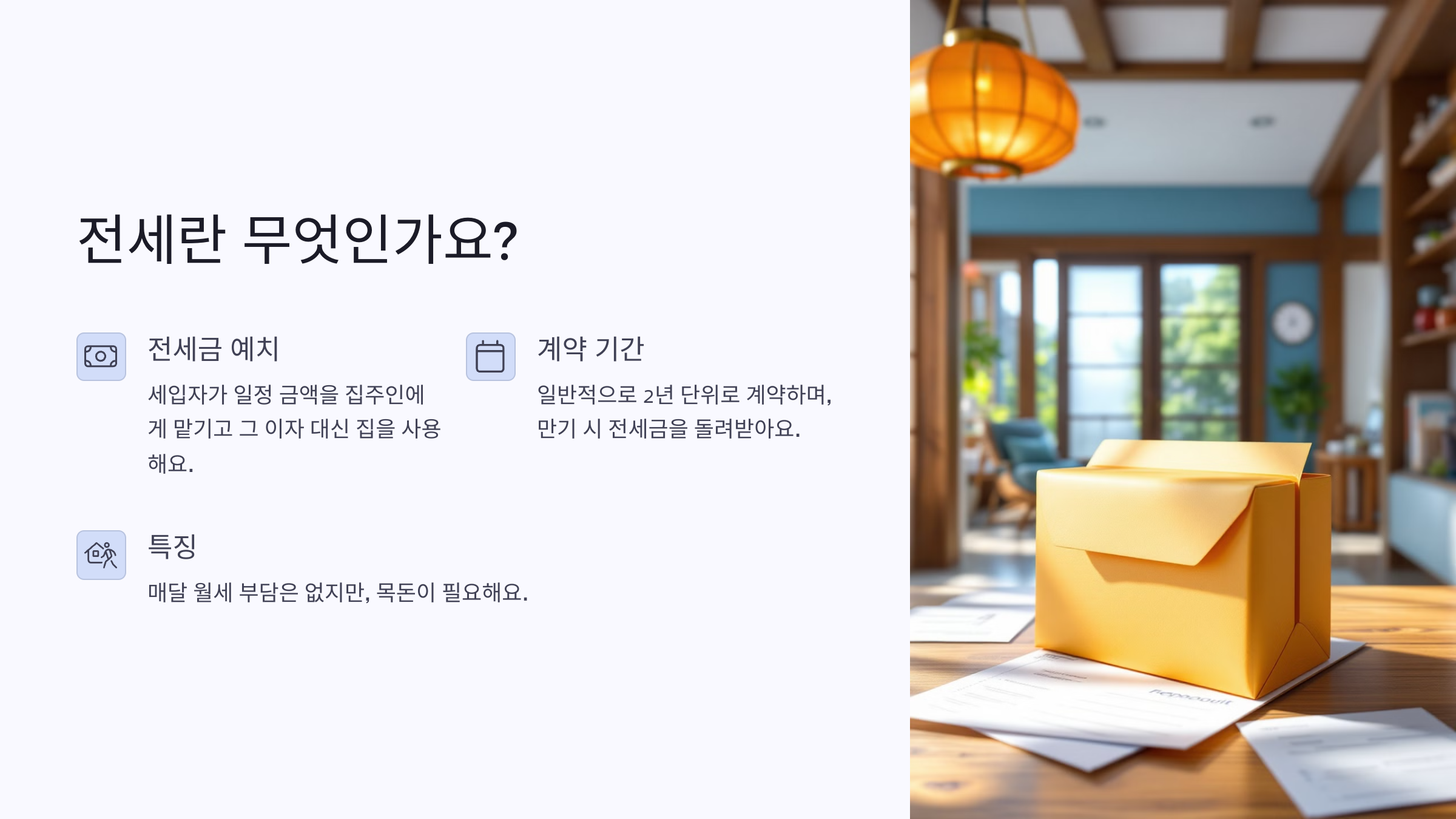 즉, 매달 월세를 내지 않고 일정한 큰돈을 한 번에 지급한 뒤, 그 돈을 담보로 집에 사는 형태라고 보면 돼요. 일반적으로 2년 단위로 계약하며, 그 기간 동안은 주거 공간을 자유롭게 이용할 수 있어요.