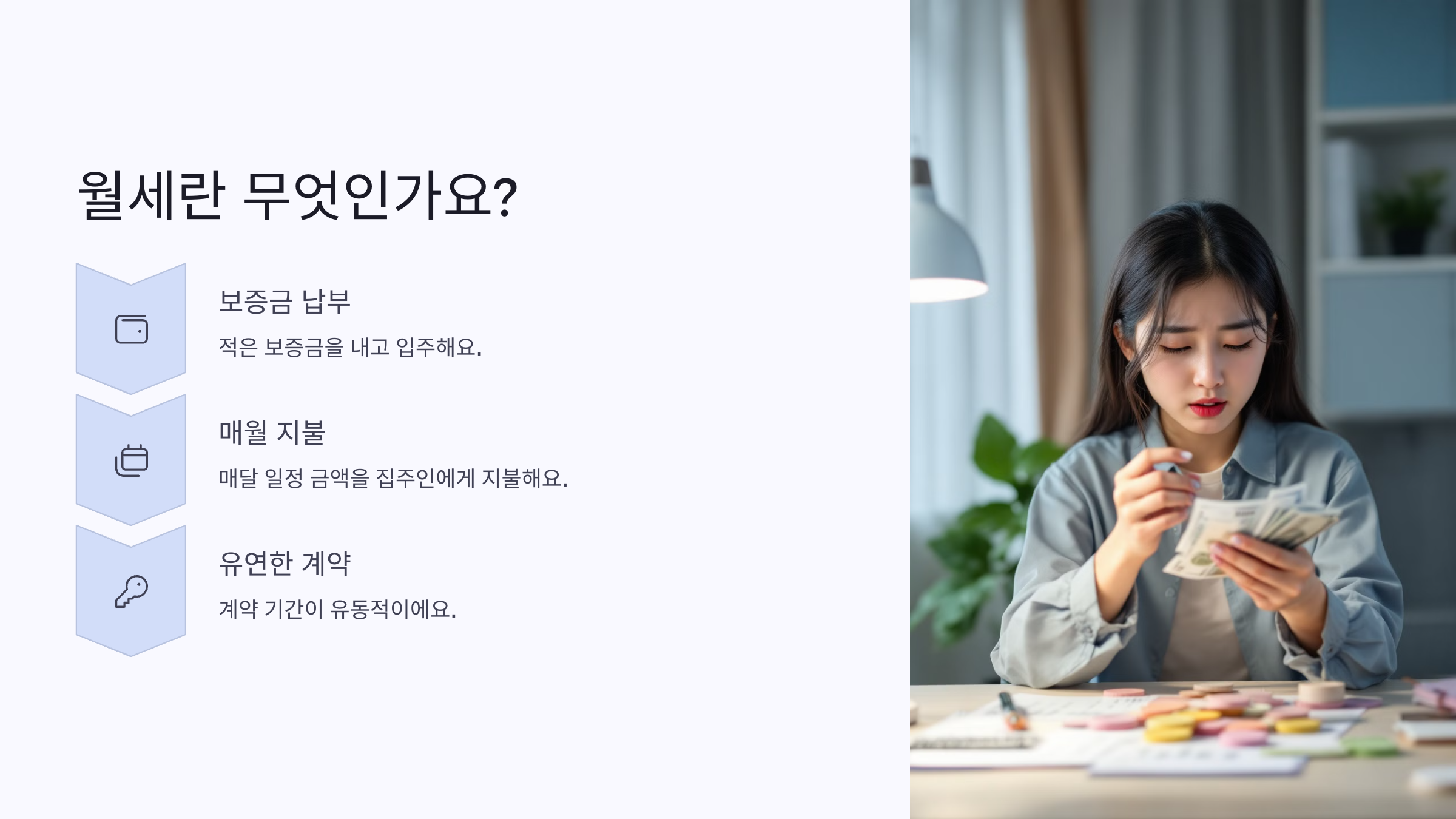 월세의 가장 큰 장점은 초기 자금 부담이 적다는 거예요. 몇 천만 원의 전세금을 마련하지 않아도 바로 입주할 수 있다는 건 특히 사회 초년생이나 신혼부부, 단기 거주자에게 유리하죠.