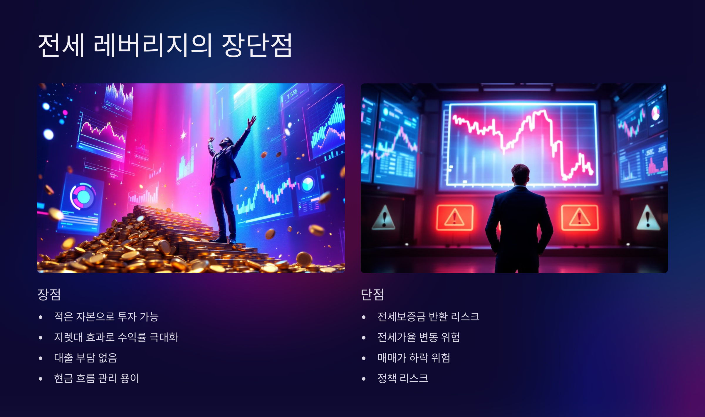 전세 레버리지는 적은 돈으로 부동산을 매입할 수 있다는 강력한 장점이 있어요. 하지만 리스크도 존재하기 때문에 신중한 접근이 필요해요. 먼저 장점부터 살펴볼게요! 😊