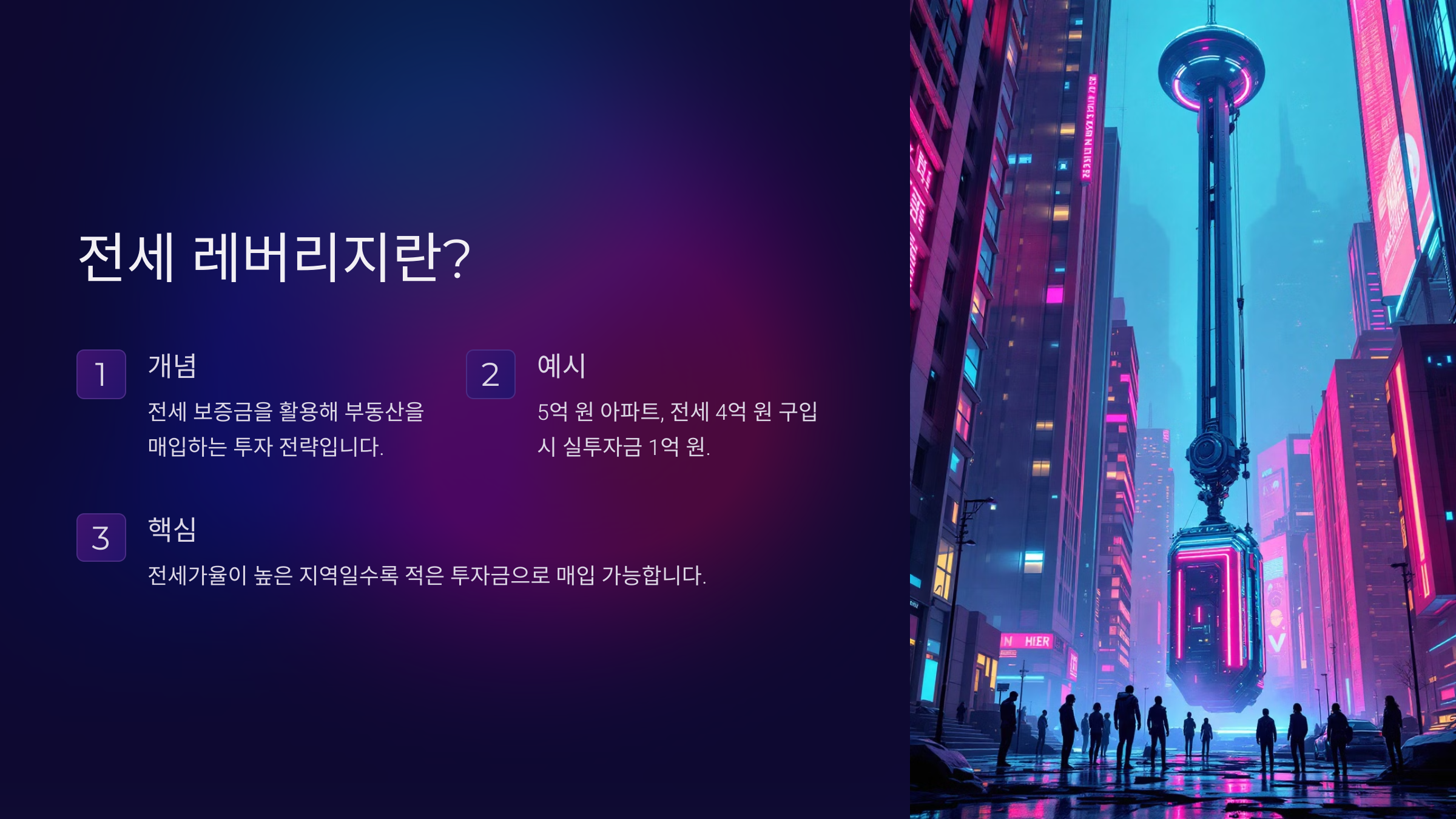 전세 레버리지는 전세 보증금을 활용해 부동산을 매입하는 투자 전략이에요. 즉, 집값의 일부만 자기 돈으로 부담하고, 나머지는 전세 보증금으로 충당하는 방식이에요.