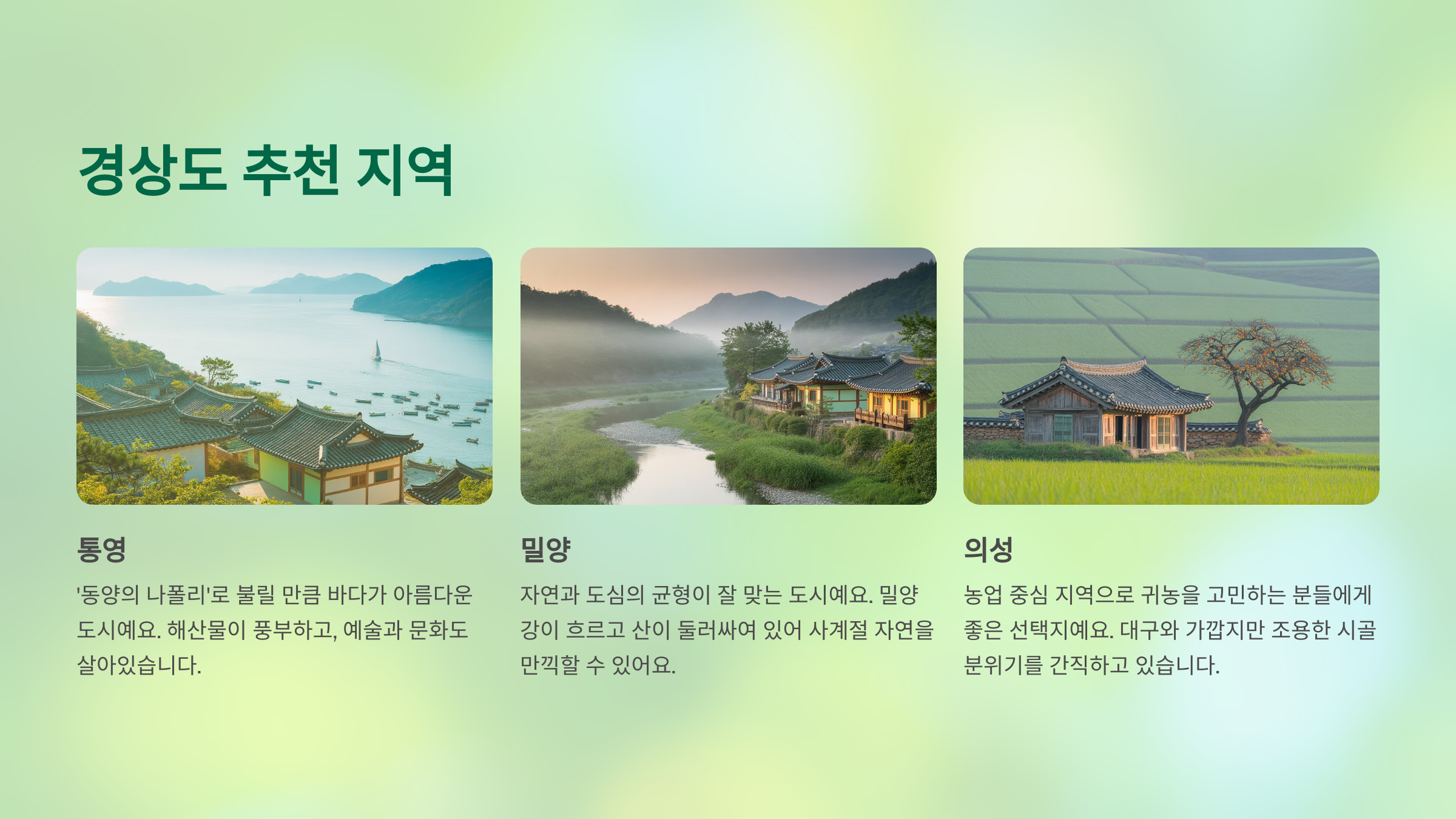 경상도는 남해 바다와 접한 아름다운 해안선, 내륙의 고즈넉한 시골 풍경이 매력적인 지역이에요. 통영, 거제, 밀양, 의성 같은 곳은 관광과 귀촌이 모두 가능한 곳들이에요. 조용하고 한적한 환경을 원하는 사람들에게 알맞죠.