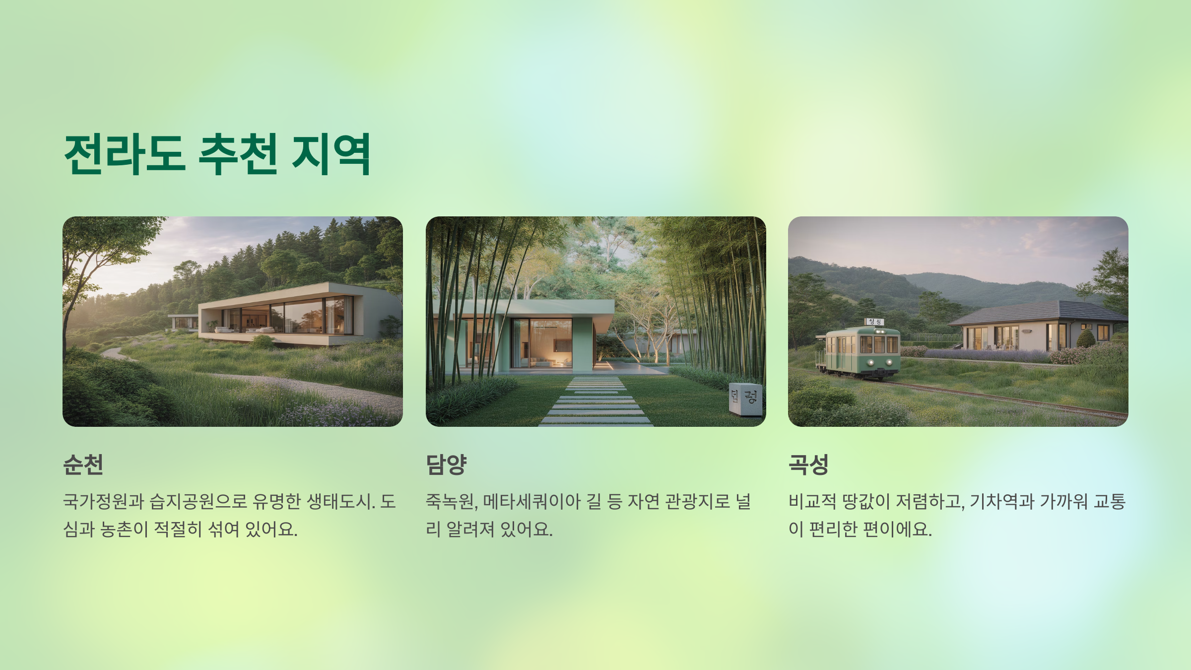 전라도는 따뜻한 기후와 풍요로운 평야 덕분에 정착하기에 좋은 전원주택 지역으로 손꼽혀요. 특히 순천, 담양, 곡성, 장흥 등은 자연환경과 농업 환경 모두 좋아서 은퇴 후 삶이나 귀촌에 적합하죠.