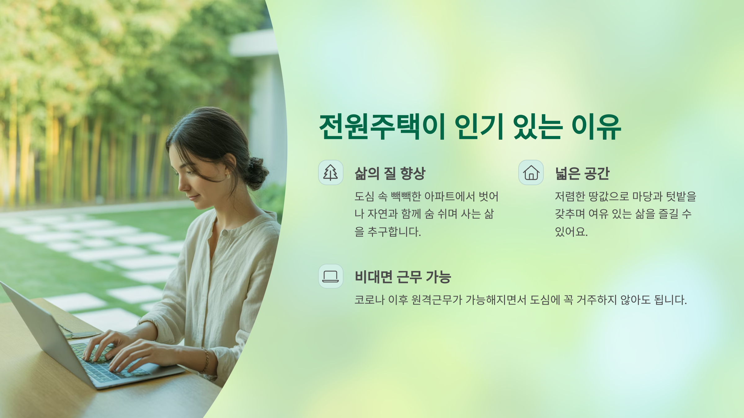 요즘 많은 사람들이 복잡한 도시 생활에서 벗어나 자연과 함께 여유롭게 지낼 수 있는 전원주택을 찾고 있어요. 특히 재택근무가 보편화되면서 시골이나 교외에서의 삶이 더 매력적으로 다가오고 있죠.