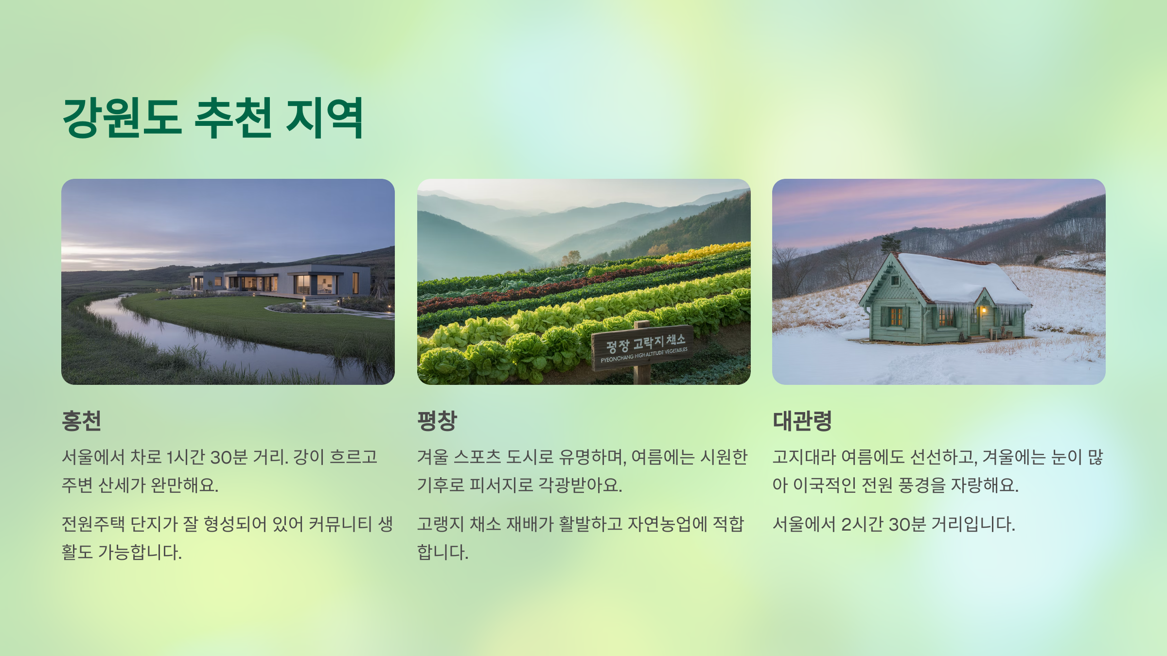 강원도는 청정 자연의 대명사예요. 울창한 숲과 맑은 계곡, 그리고 시원한 바람 덕분에 사계절 내내 자연을 느끼며 살 수 있는 지역이죠. 특히 대관령, 홍천, 평창, 원주 등은 접근성과 자연환경 모두 만족시켜주는 곳이랍니다.