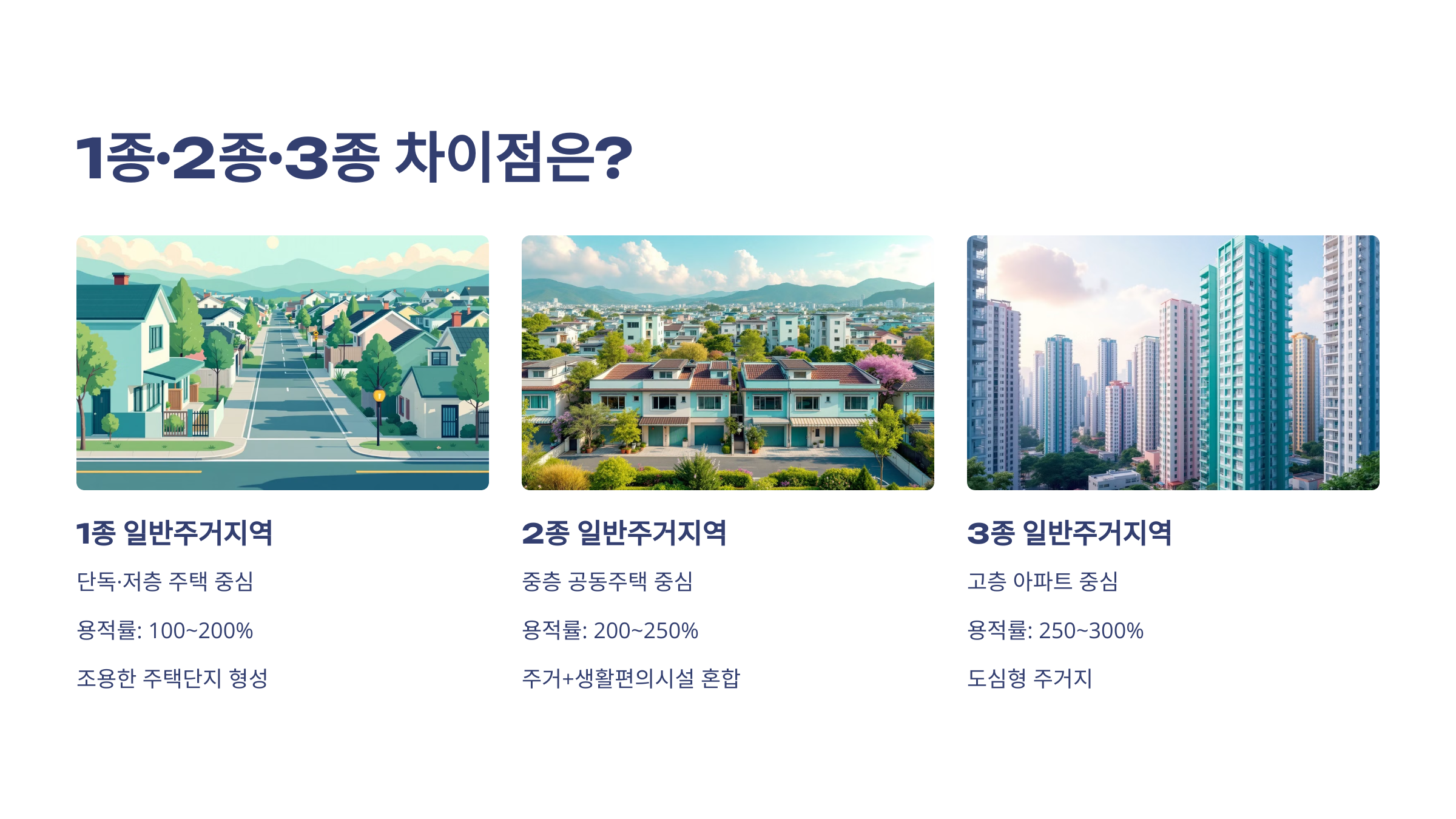 1종은 단독주택 위주의 지역이에요. 소형 건물 위주로 조용한 주택단지를 형성하는 곳이 많죠. 반면 3종은 대단지 아파트, 상가 복합시설 등도 들어설 수 있는 곳이에요. 2종은 그 중간 단계로 보면 돼요.