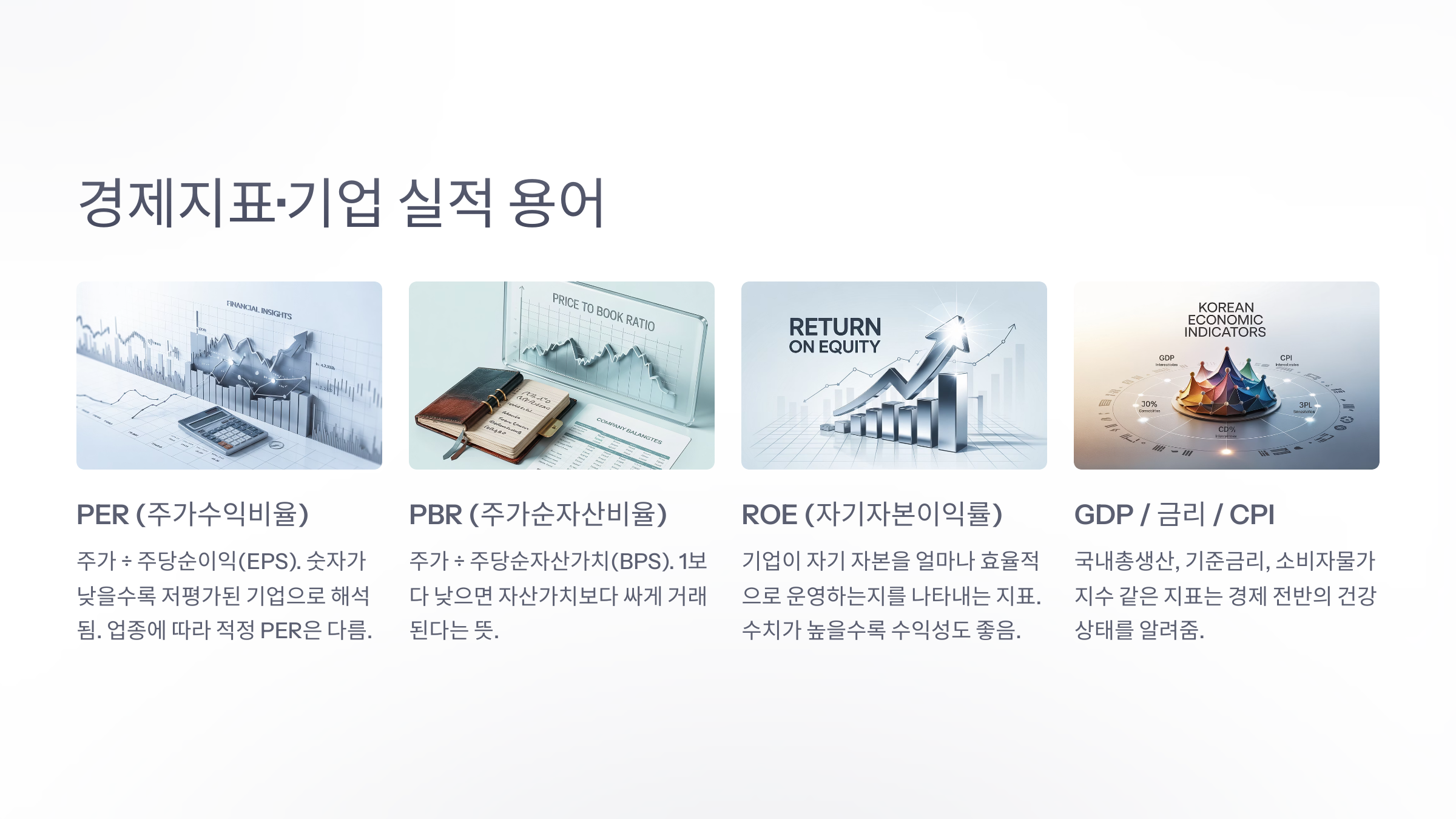 이제 시장 흐름까지 읽을 수 있다면, ‘전체 그림’을 보는 눈이 생긴 거예요. 다음은 기업 분석이나 뉴스에서 자주 등장하는 경제지표와 실적 용어들을 정리해드릴게요! 📑