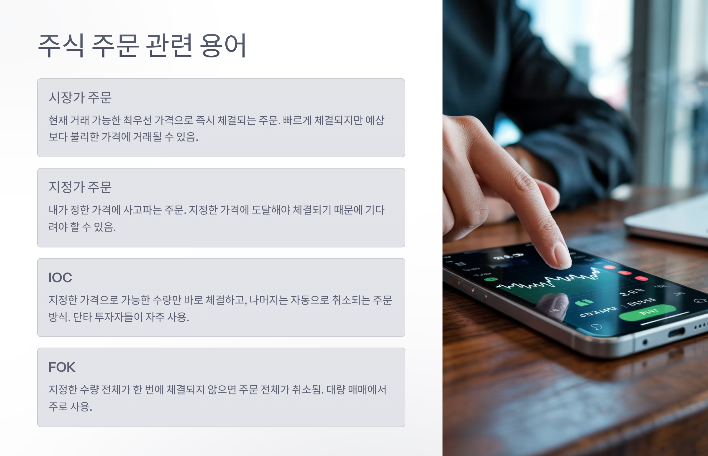 이 정도 용어만 알아도 주식 앱 화면에 나오는 내용 대부분은 해석할 수 있어요. 이제 주문과 관련된 용어로 넘어가서, 실전 매매에 꼭 필요한 개념들을 정리해볼게요! 💼
