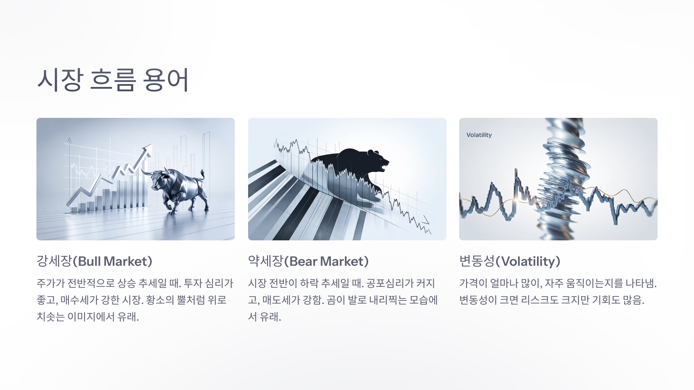| 변동성 | 가격의 움직임 폭 | 크면 기회·위험 모두 큼 |