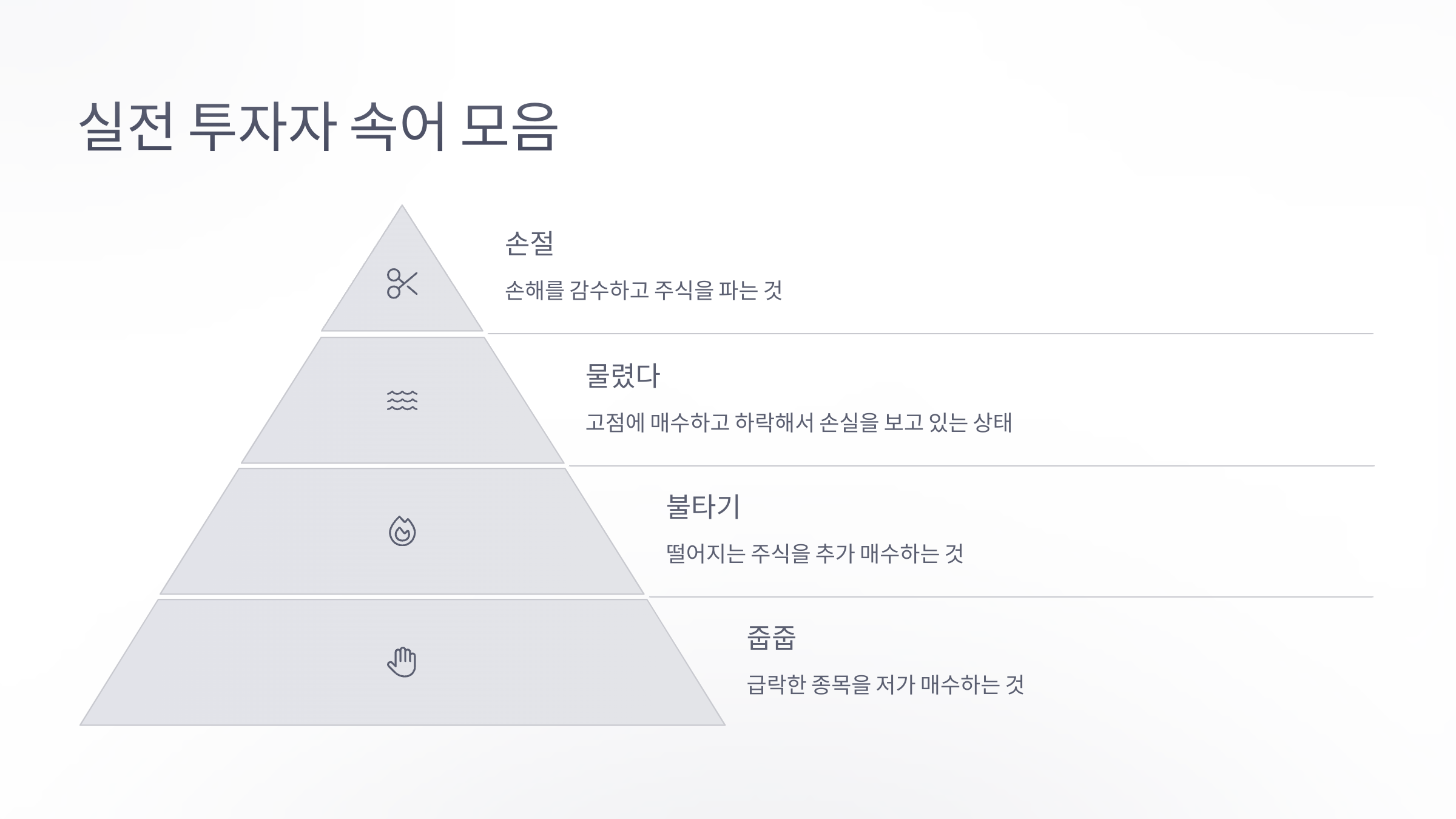 손절: 손해를 감수하고 주식을 파는 거예요. “더 떨어지기 전에 손절했어”처럼 써요.