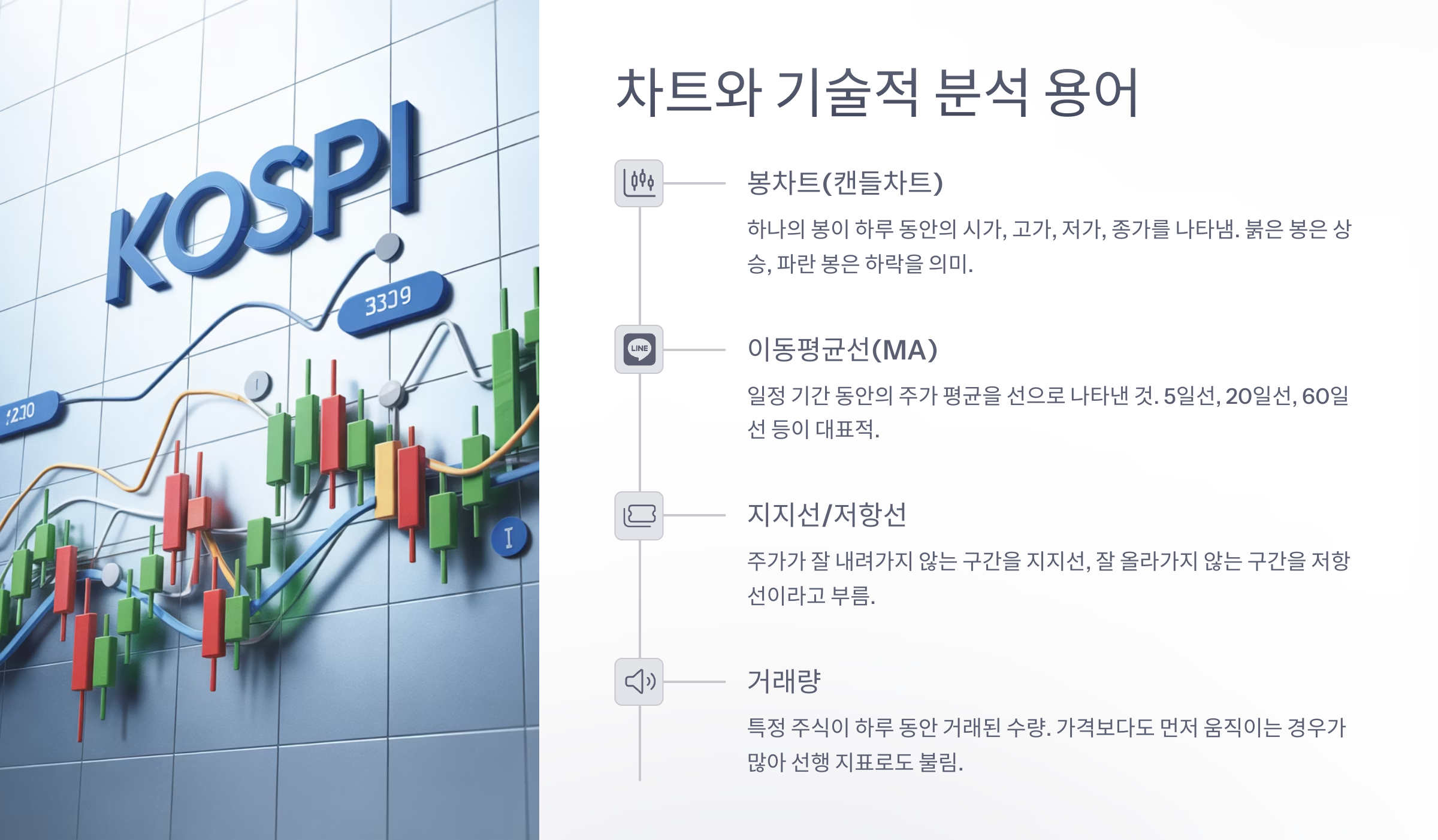 주문 방식만 잘 이해해도 실수로 높은 가격에 매수하거나, 헛손질하는 일을 피할 수 있어요. 이제 차트를 보면서 판단하는 데 필요한 용어들로 넘어가 볼게요! 📊