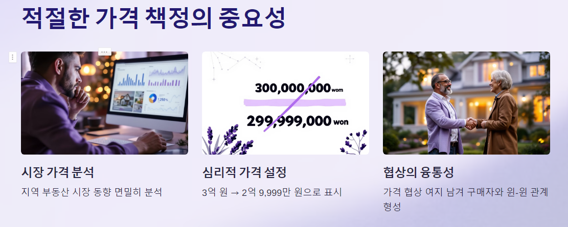 • 참고 사례: 만약 주변 시세가 평당 1,500만 원이라면, 비슷한 조건의 집을 시세보다 약간 낮게 책정하는 것이 경쟁을 유도할 수 있습니다.