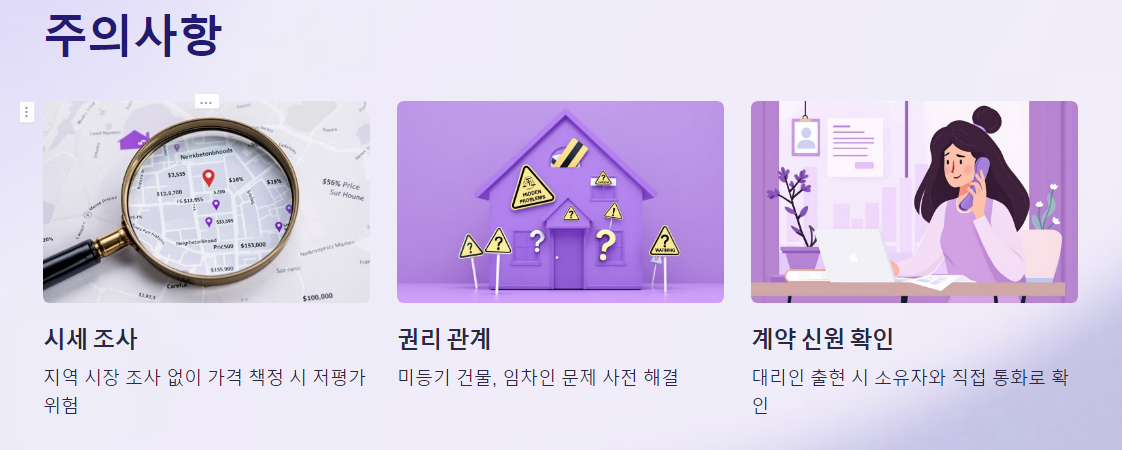 • 필요한 경우 법적 문제에 대한 전문가의 의견을 제공해 구매자가 안심할 수 있도록 돕습니다.