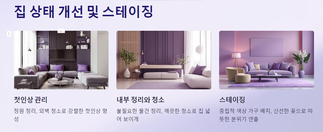 집의 외관은 구매자에게 강렬한 첫인상을 남깁니다. 정원 정리, 외벽 청소 등 간단한 개선만으로도 큰 효과를 볼 수 있습니다.