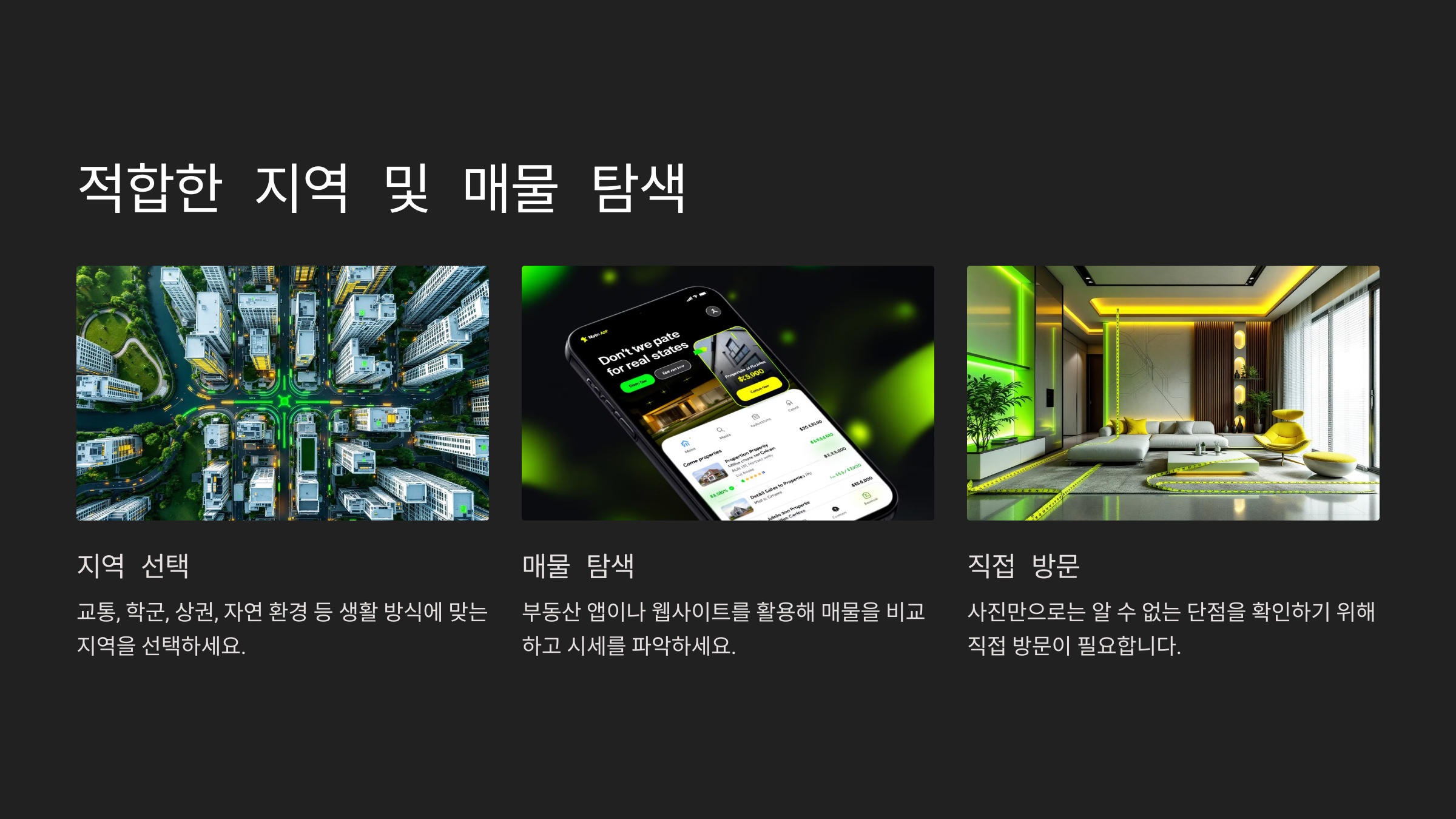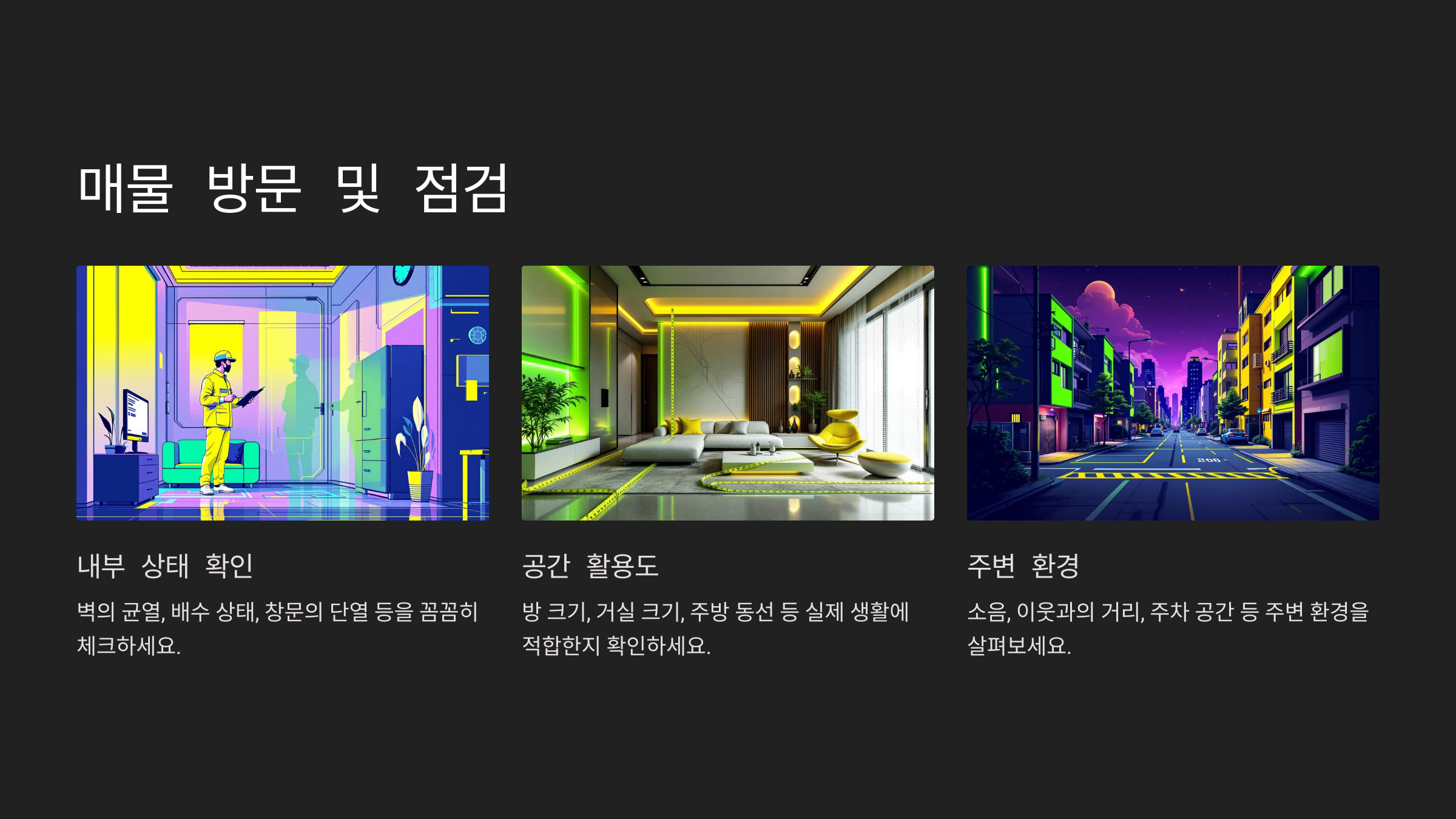 매물 검색 시, 단순히 사진이나 설명만 믿지 말고 직접 방문해서 확인하는 것을 추천해요. 사진에서는 보이지 않는 단점들이 있을 수 있으니 눈으로 직접 보는 것이 안전해요. 이 과정에서 주택의 구조, 층수, 방향 등 본인의 우선순위와 맞는지 꼼꼼히 점검하세요.