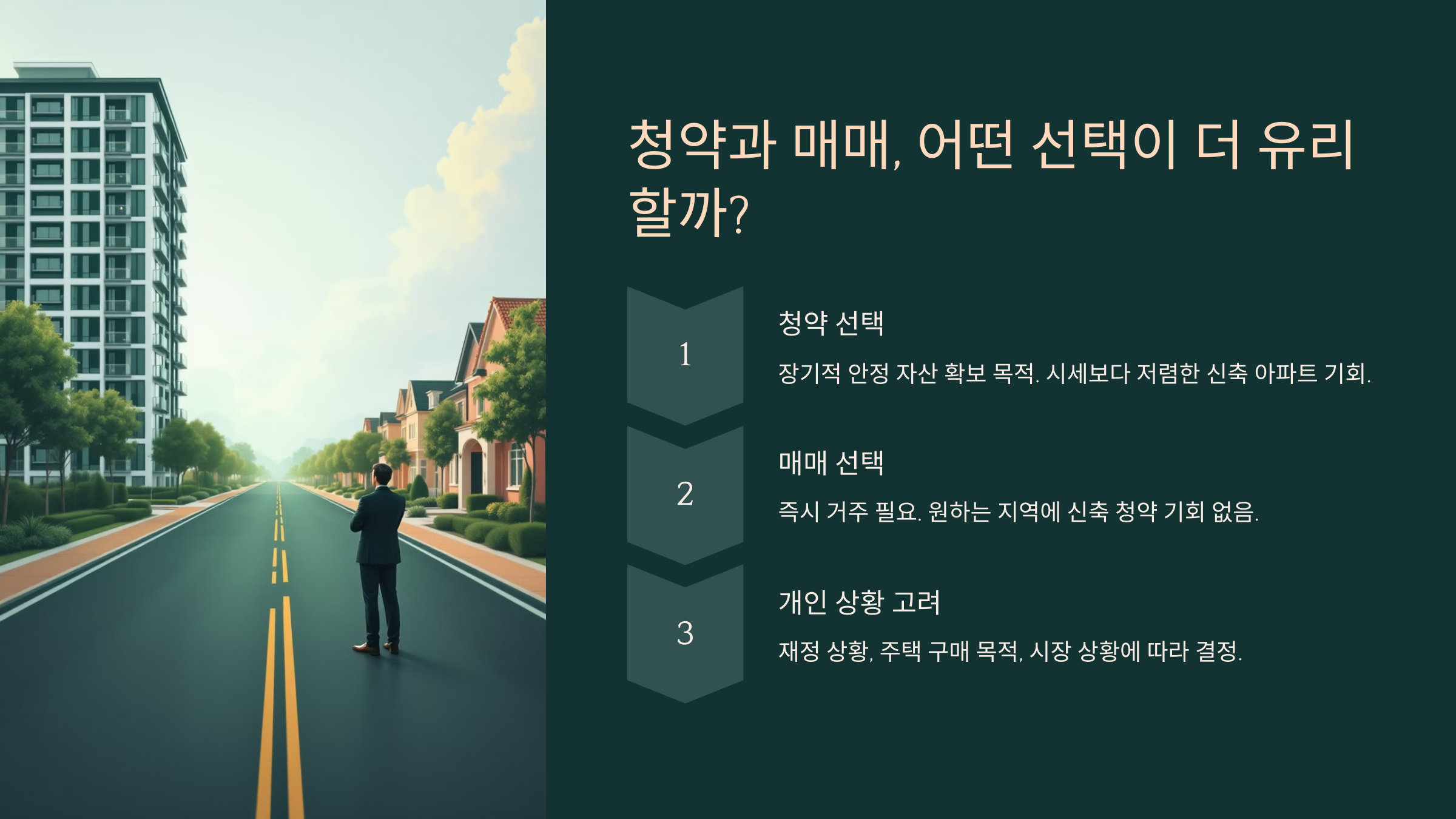 반면, 당장 거주가 필요하거나 원하는 지역에 신축 청약 기회가 없다면 기존 아파트 매매가 현실적인 선택이 될 수 있어요. 청약 당첨을 기다리는 동안 임대료를 내야 하거나 원하는 아파트를 얻지 못할 수도 있기 때문이에요.