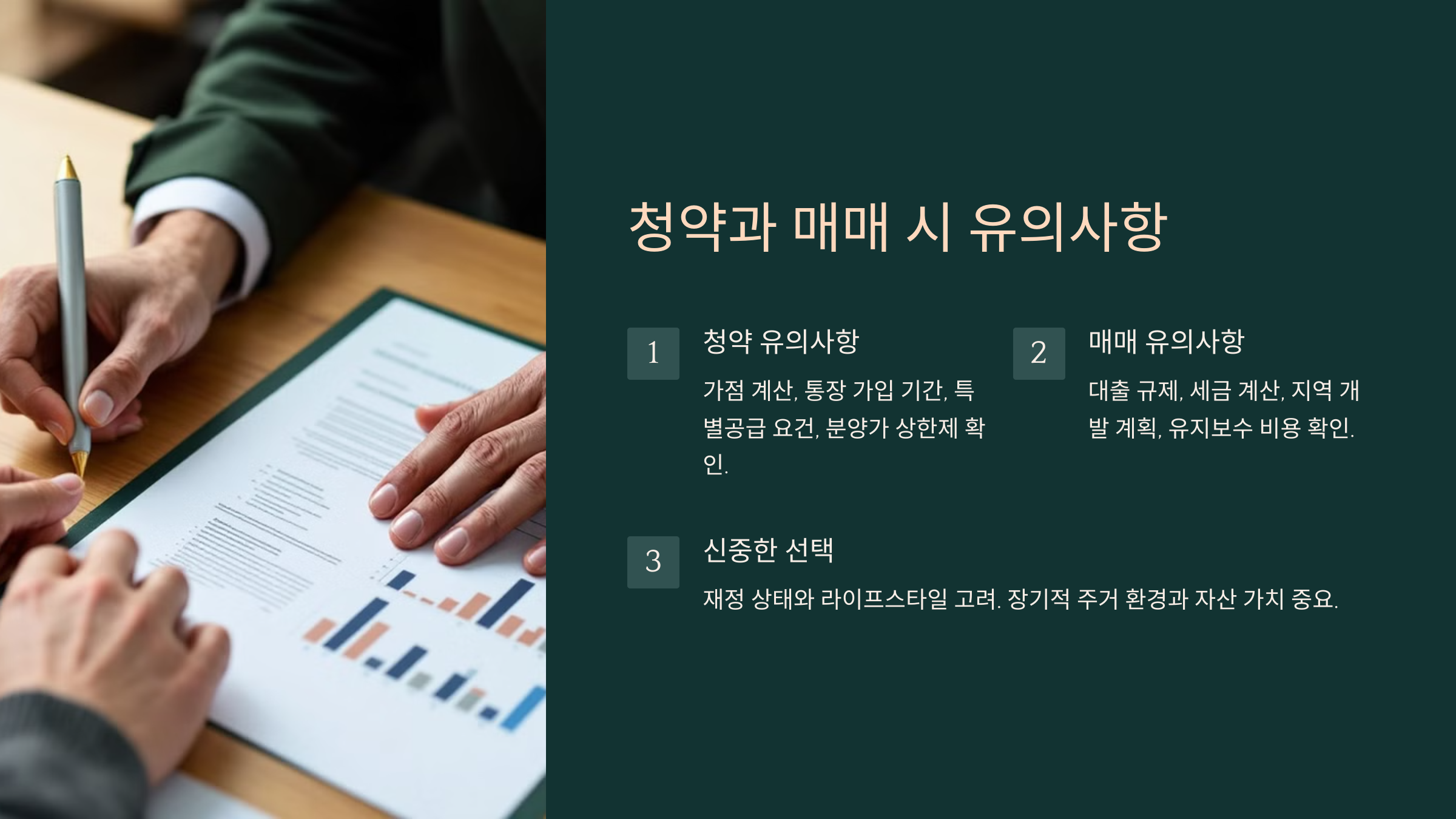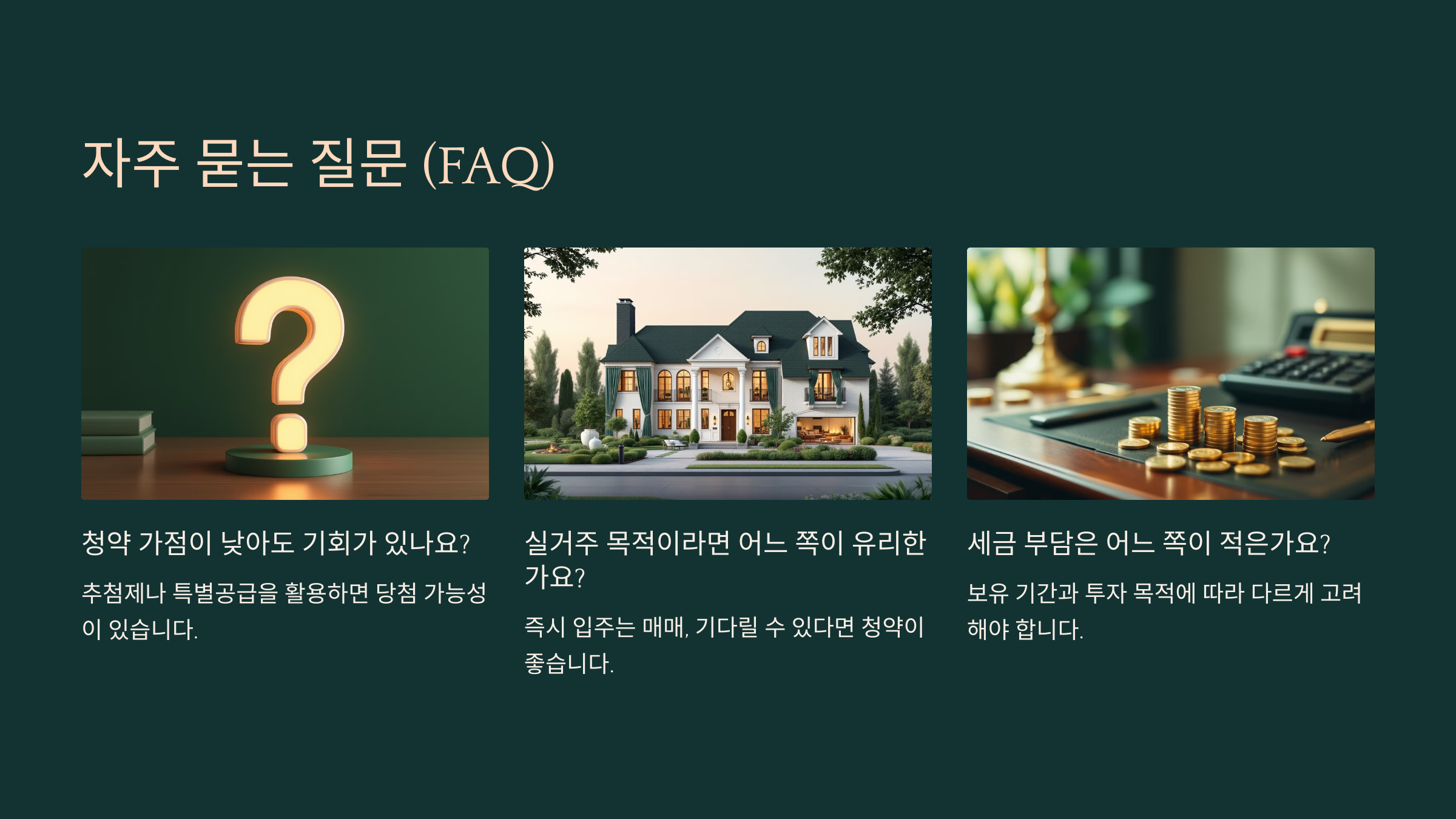 💡 청약과 매매 모두 장점과 단점이 있기 때문에, 자신의 재정 상태와 라이프스타일을 고려한 신중한 선택이 필요해요. 장기적으로 안정적인 주거 환경을 확보하면서도 자산 가치를 높이는 것이 가장 중요한 포인트랍니다!