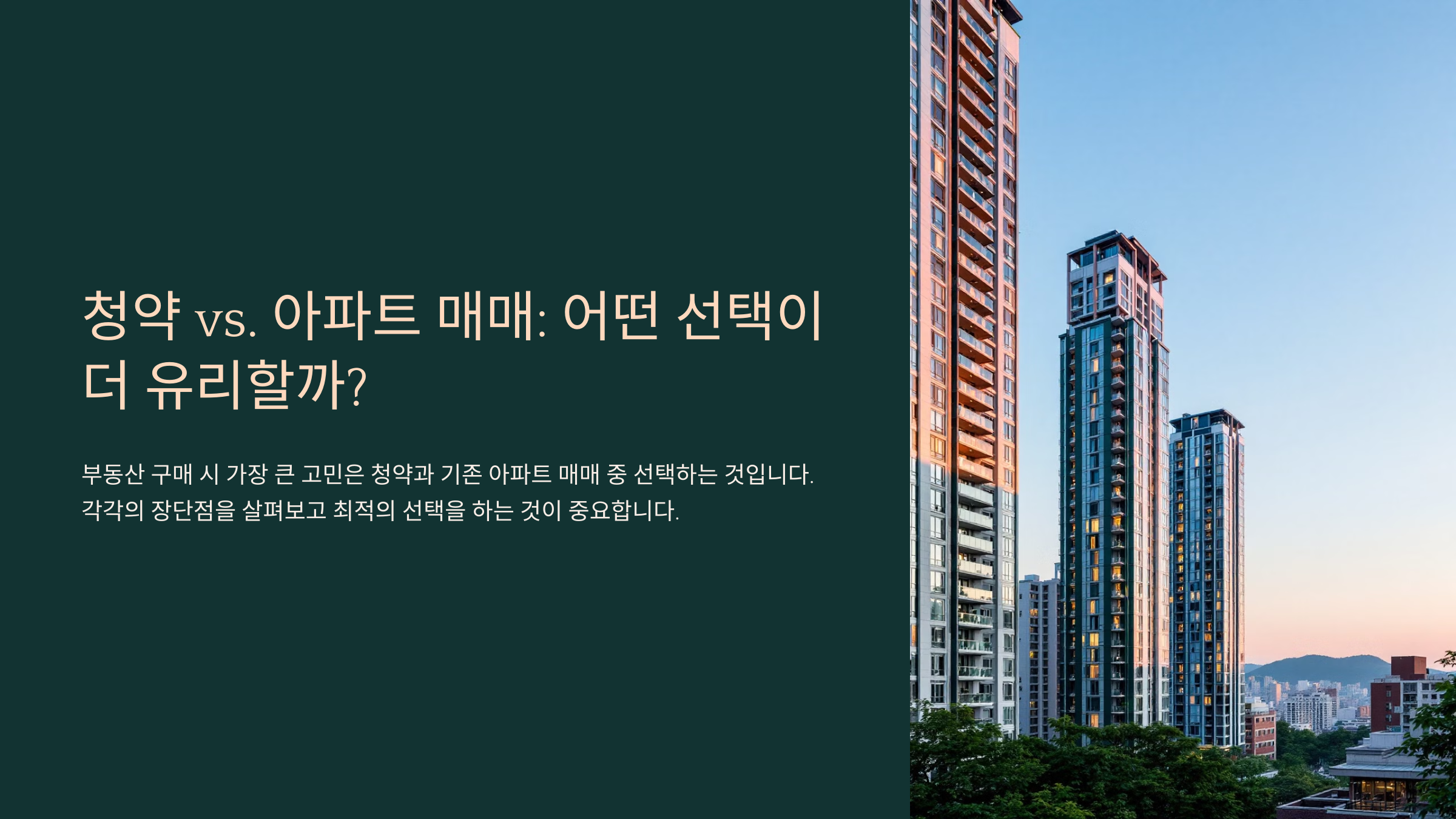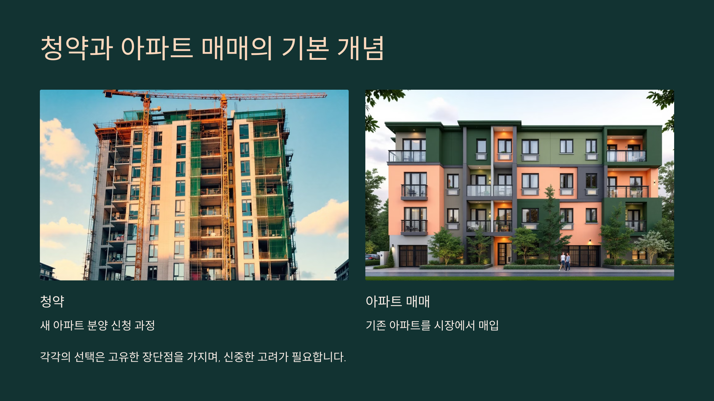 부동산을 구입할 때 가장 먼저 고민하게 되는 것이 바로 ‘청약을 넣을까, 아니면 기존 아파트를 매매할까?’ 하는 점이에요. 청약은 비교적 저렴한 가격에 새 아파트를 마련할 기회가 있는 반면, 기존 아파트 매매는 즉시 입주할 수 있고 원하는 지역을 선택할 수 있다는 장점이 있어요.