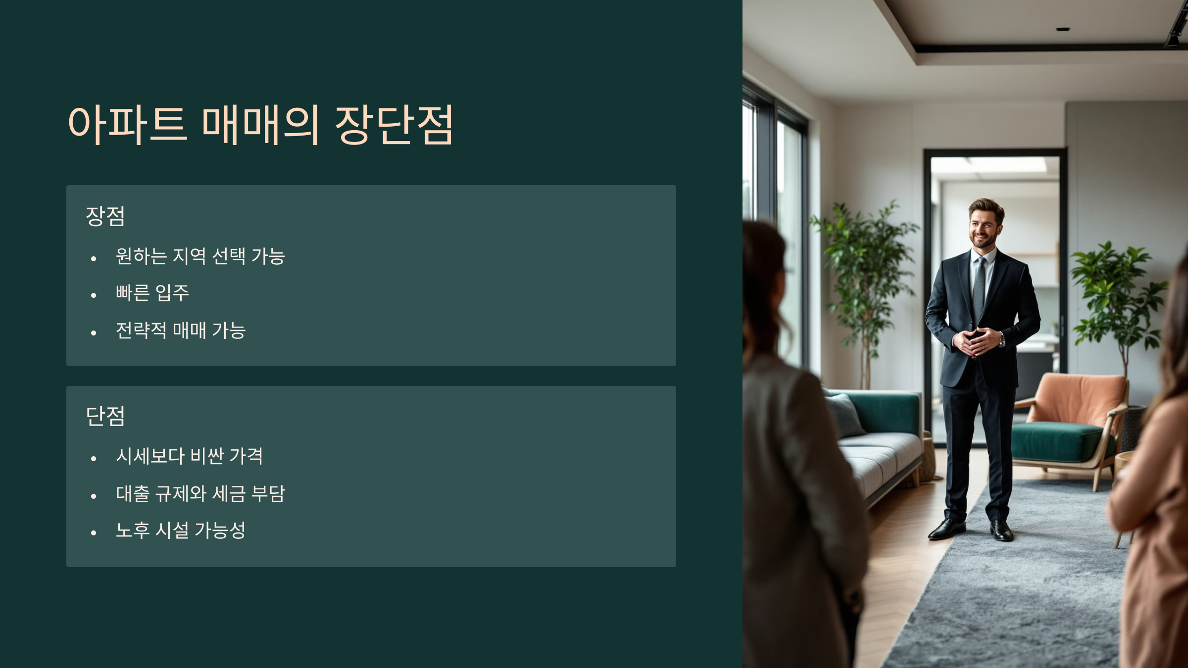 반면, 아파트 매매는 기존에 지어진 아파트를 시장에서 매입하는 방법이에요. 원하는 지역, 입지 조건, 가격 등을 고려해 선택할 수 있으며, 계약이 성사되면 빠르게 입주가 가능하다는 장점이 있어요. 하지만 시세에 따라 가격 변동이 크고, 부동산 경기나 대출 규제 등에 영향을 받을 수 있답니다.