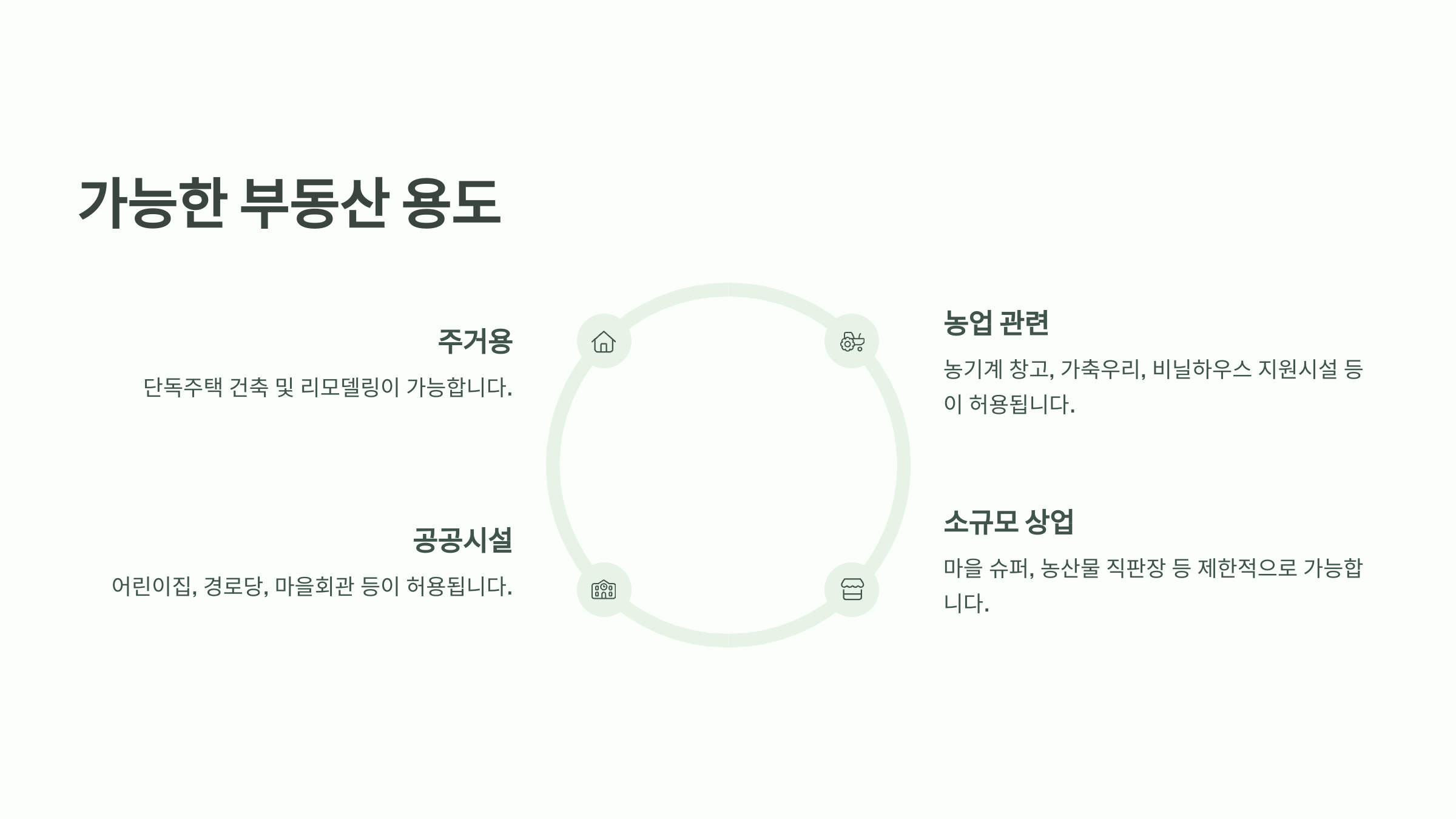 이 외에도 농업 관련 건축물 예를 들면, 농기계 보관용 창고, 가축우리, 비닐하우스 지원시설 등도 대부분 허용되고 있어요. 물론 지자체 조례와 관련 법령에 따라 구체적인 요건이 따르긴 하지만, 일반 농업용 목적이라면 대부분 수용되는 분위기예요.