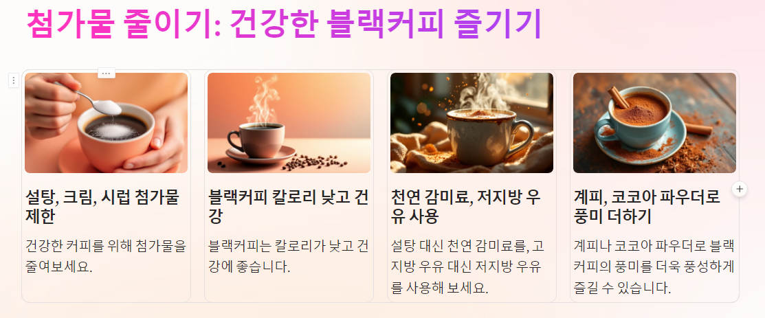 커피를 마실 때 설탕, 크림, 시럽과 같은 첨가물을 자주 사용하는 경우, 칼로리가 급격히 증가하여 건강에 해로울 수 있습니다. 블랙커피는 칼로리가 거의 없고, 커피 본연의 맛을 느낄 수 있어 가장 건강한 선택입니다.