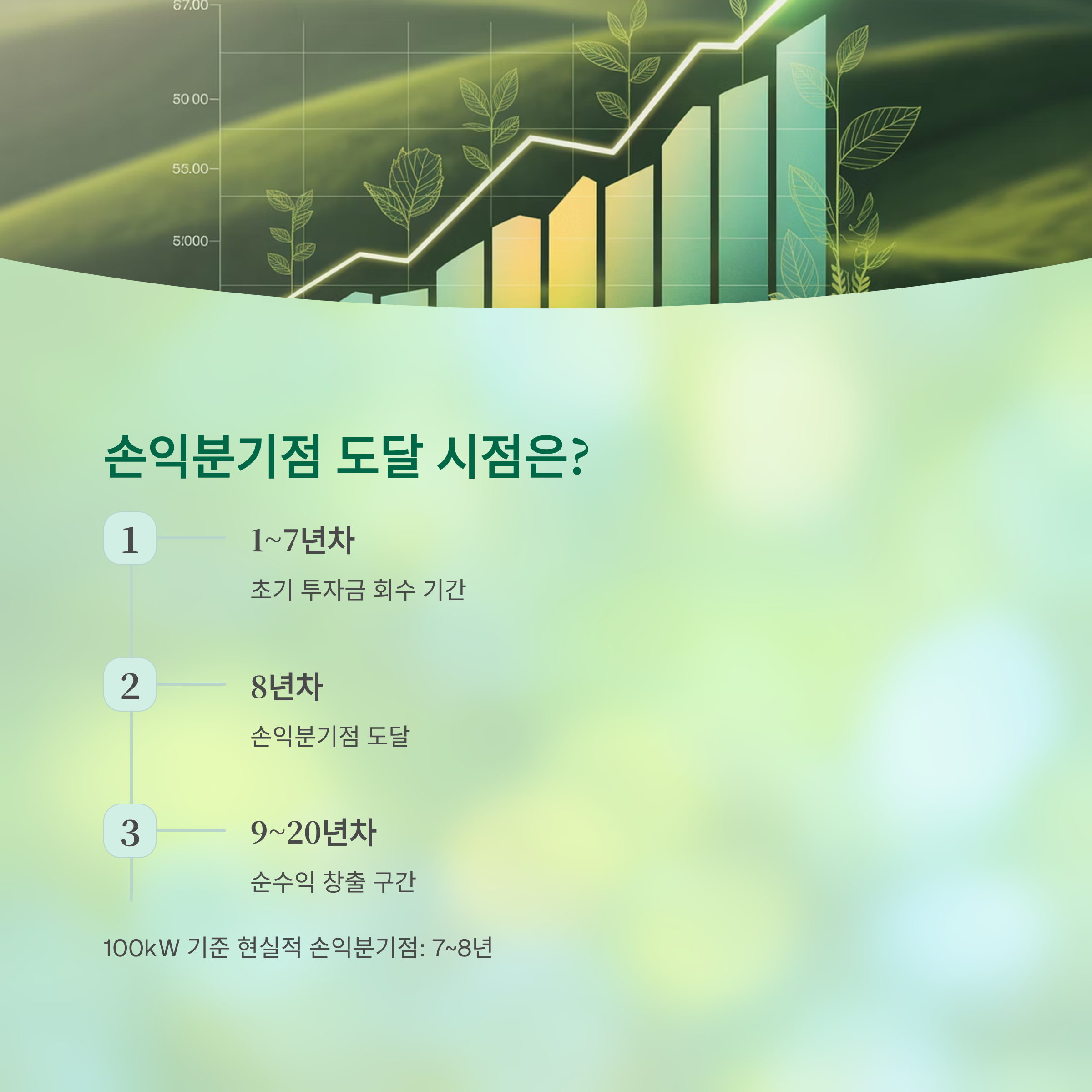 그렇기 때문에 실제 손익분기점은 보수적으로 잡아야 안전해요. 전문가들은 100kW 기준 8년 전후를 현실적인 손익분기점으로 제시하고 있어요. 이후부터는 고정 지출이 거의 없기 때문에, 10년부터는 ‘순수익만 남는 구간’에 진입하게 되는 거죠. 발전소의 내구연한은 20년 이상이기 때문에, 이후 10년간은 거의 현금창출 구조예요.