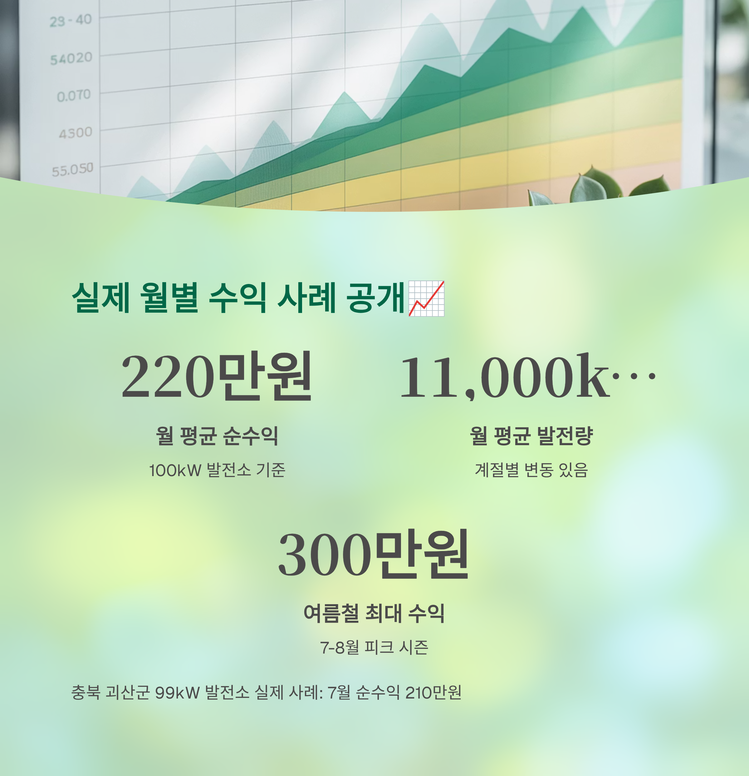 여기에 전력계통 연결비, 유지관리비, 보험료 등을 제하면 순수익은 월 200~220만원 사이로 조정돼요. 여름철에는 발전량이 많아서 최대 300만원까지도 올라가는 경우가 있어요. 반면 겨울에는 발전량이 줄어 150만원 안팎으로 떨어질 수도 있죠.