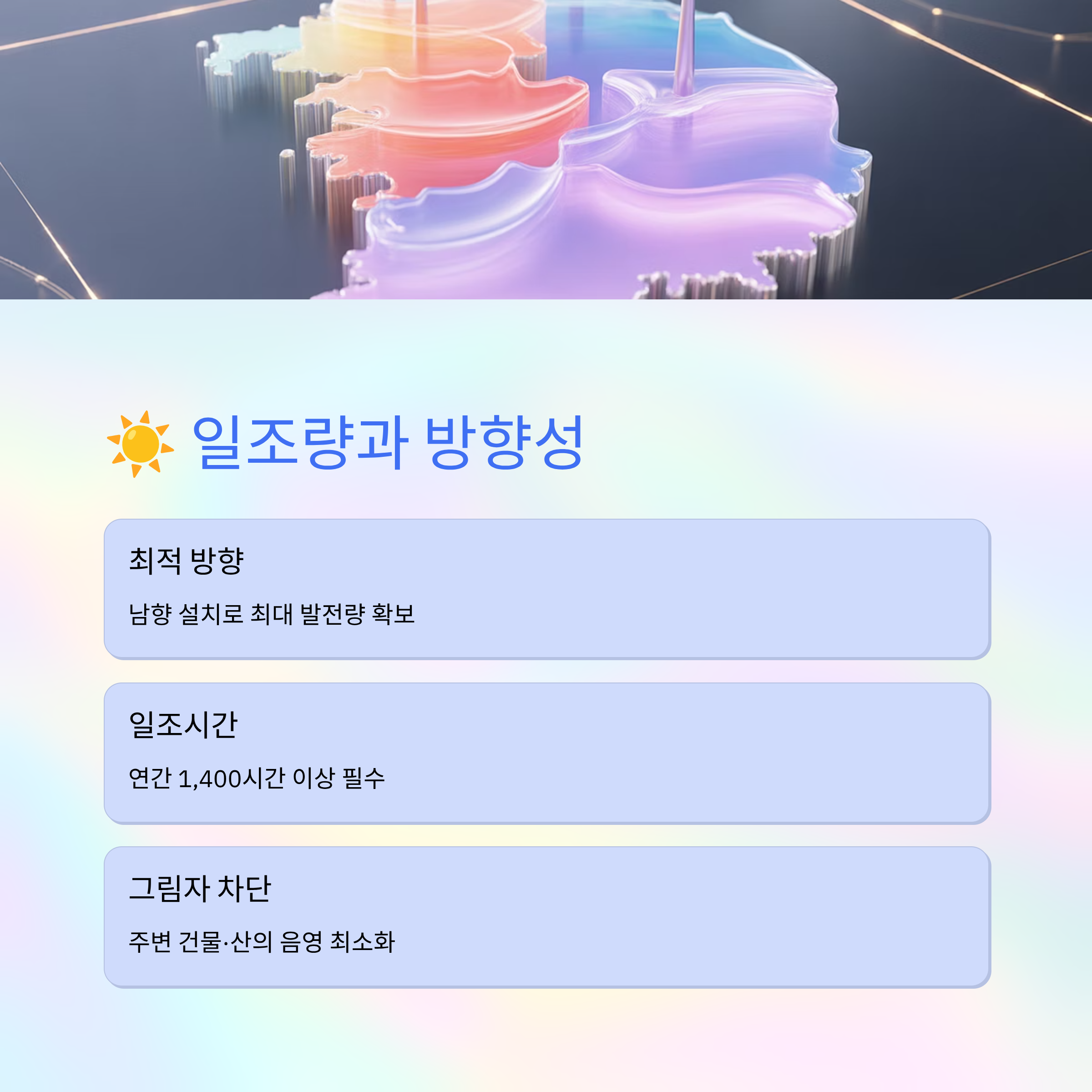 태양광 발전의 성패는 햇빛을 얼마나 안정적으로 받을 수 있는지에 달려 있어요. 아무리 땅이 넓고 저렴하더라도, 연중 일조량이 부족하면 발전 효율이 떨어지고 수익성도 낮아질 수밖에 없어요. 특히 우리나라에서는 남향에 가까운 방향이 가장 이상적이에요. 경사가 적당히 있는 남향 부지는 태양광 모듈이 하루 종일 햇빛을 고르게 받을 수 있어 발전 효율이 높아져요.