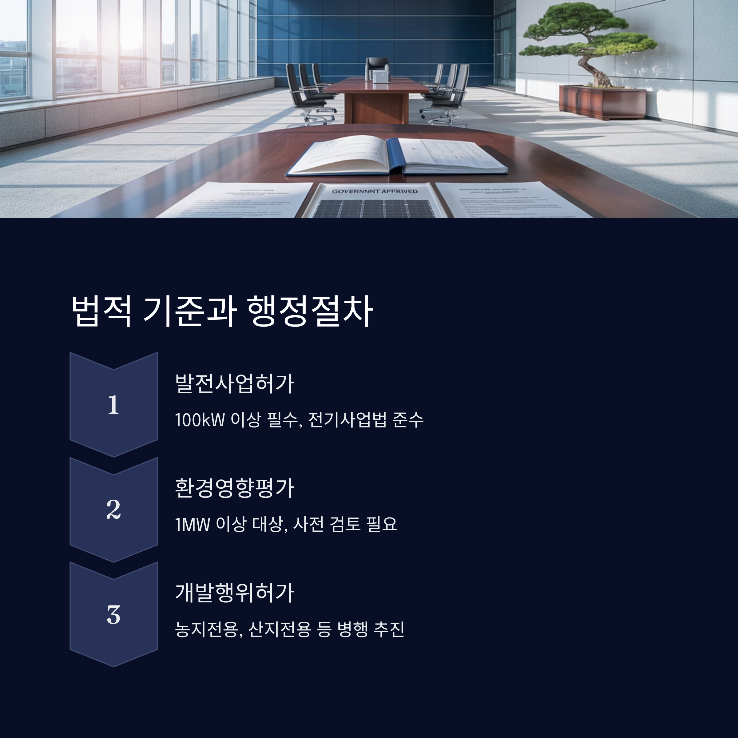 먼저 전기사업법에 따라 100kW 이상 발전소는 발전사업허가를 받아야 하고, 1MW 이상이면 환경영향평가 대상이 될 수 있어요. 또 개발행위 허가, 건축 허가, 산지 전용 허가 등도 병행해서 준비해야 해요.