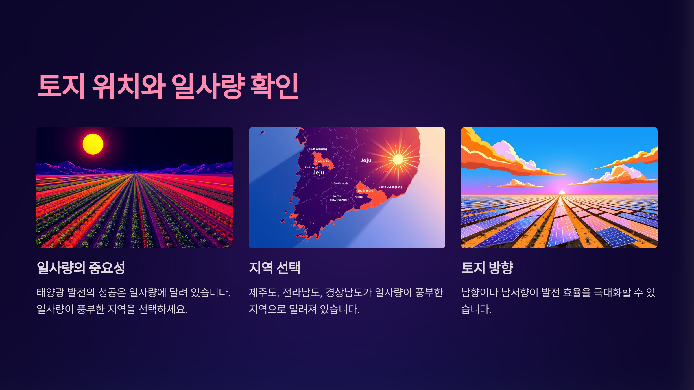 태양광 발전의 성공은 무엇보다도 **일사량**에 달려 있어요. 일사량은 태양광 패널이 얼마나 많은 태양 에너지를 받을 수 있는지를 결정하는 핵심 요소랍니다. 한국에서는 특히 제주도, 전라남도, 경상남도 지역이 일사량이 풍부한 곳으로 알려져 있어요.
