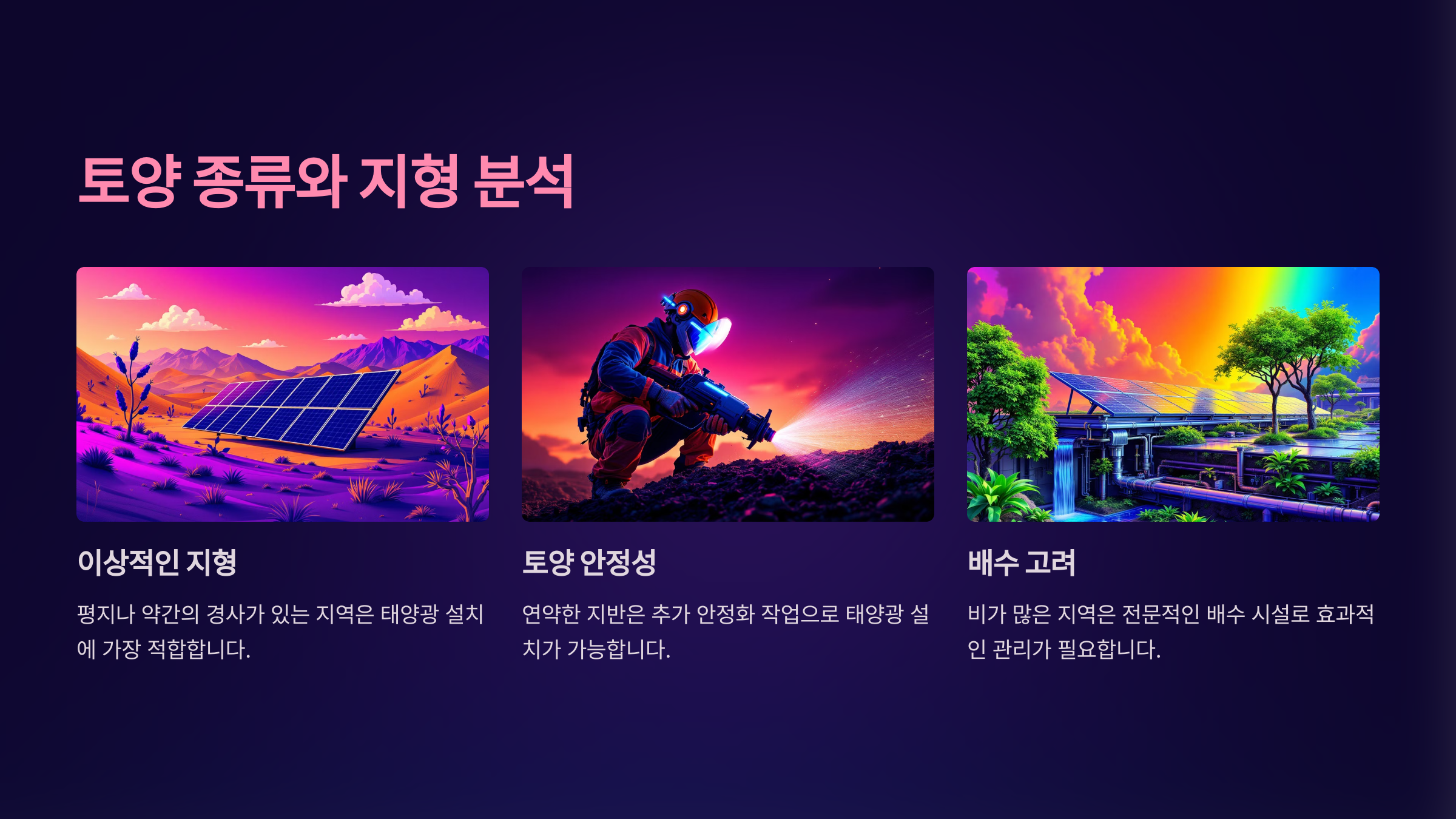 토양과 지형은 태양광 패널의 배열 방식과 구조물의 설치 방법에도 영향을 미쳐요. 이를 미리 분석하고 준비하는 것이 비용과 효율을 모두 잡는 방법이에요.