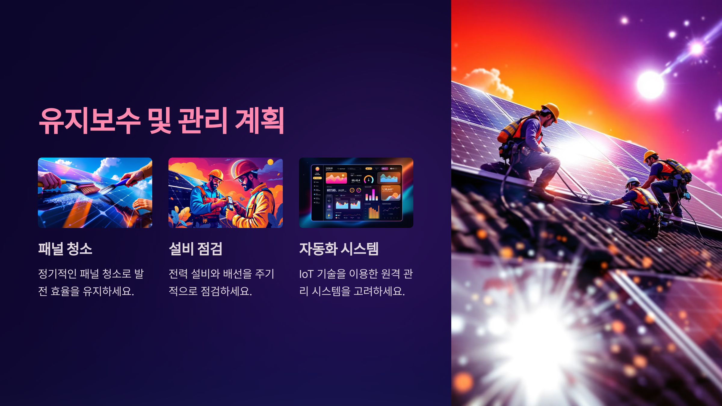 태양광 발전소는 설치 후에도 꾸준한 관리가 필요해요. 패널 청소, 전력 설비 점검, 배선 관리 등 다양한 유지보수 작업이 필요하답니다. 특히 패널에 먼지나 이물질이 쌓이면 발전 효율이 떨어질 수 있어요.