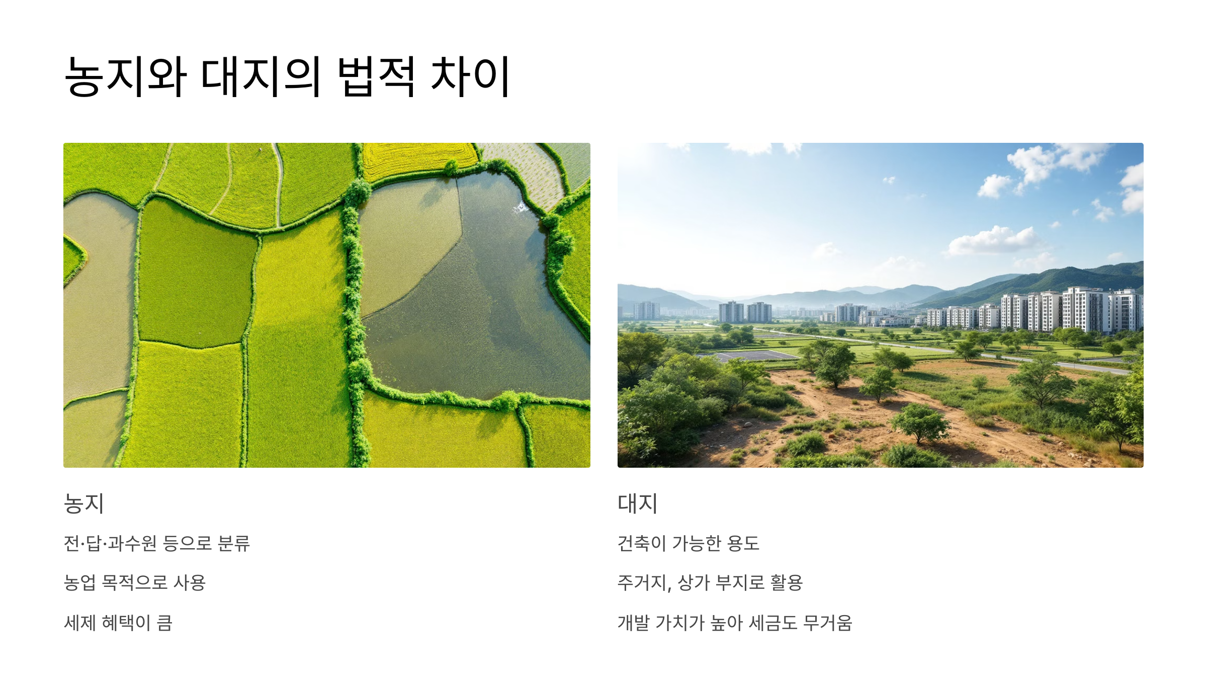 농지와 대지는 단순히 ‘밭이냐 땅이냐’ 수준이 아니에요. 토지대장 상의 지목에 따라 법적 성격과 세금 기준이 달라져요. 농지는 전·답·과수원 등을 말하고, 대지는 건축이 가능한 용도죠.