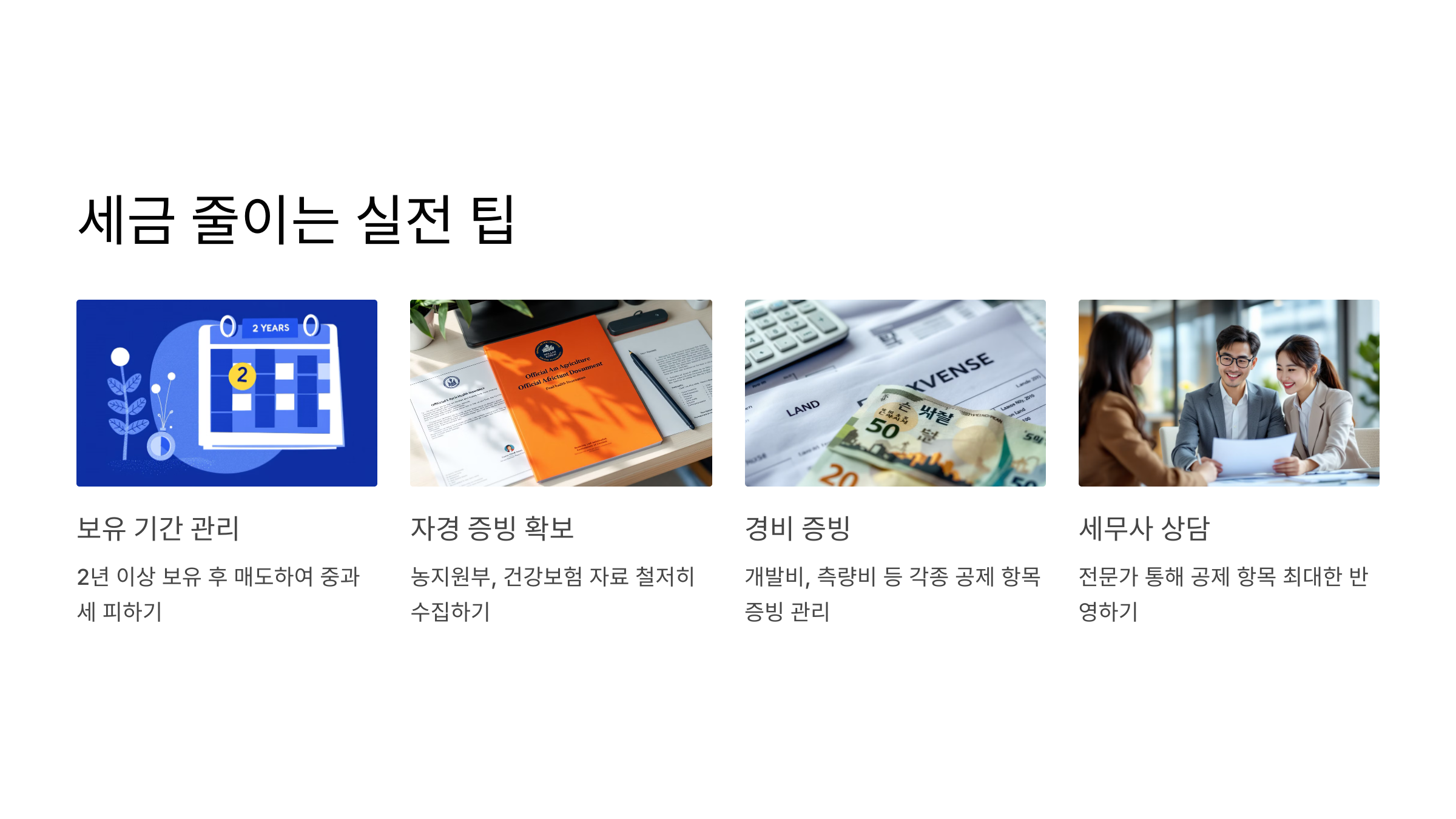 농지는 자경 증빙을 미리 준비해두고, 대지는 2년 이상 보유 후 매도하는 게 기본이에요. 그리고 공제 가능한 경비(개발비용, 측량비, 등기비용 등)를 철저히 챙겨서 신고하는 게 핵심이에요.