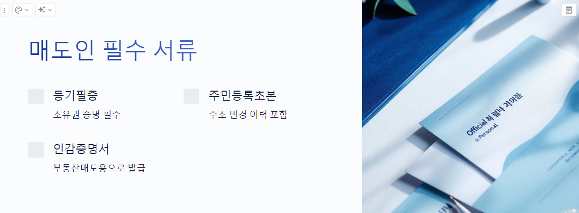 - 상속 증명 서면: 상속인이 매도인일 경우, 가족관계증명서와 상속재산분할협의서를 준비해야 합니다.