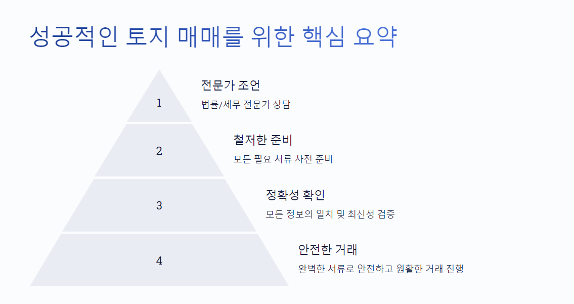 토지 매매는 적절한 서류 준비와 철저한 계획이 필요한 중요한 거래입니다. 매도인과 매수인 모두 필수 서류를 사전에 준비하고, 공통 서류와 추가적으로 필요한 문서까지 철저히 확인함으로써 거래를 원활히 진행할 수 있습니다.