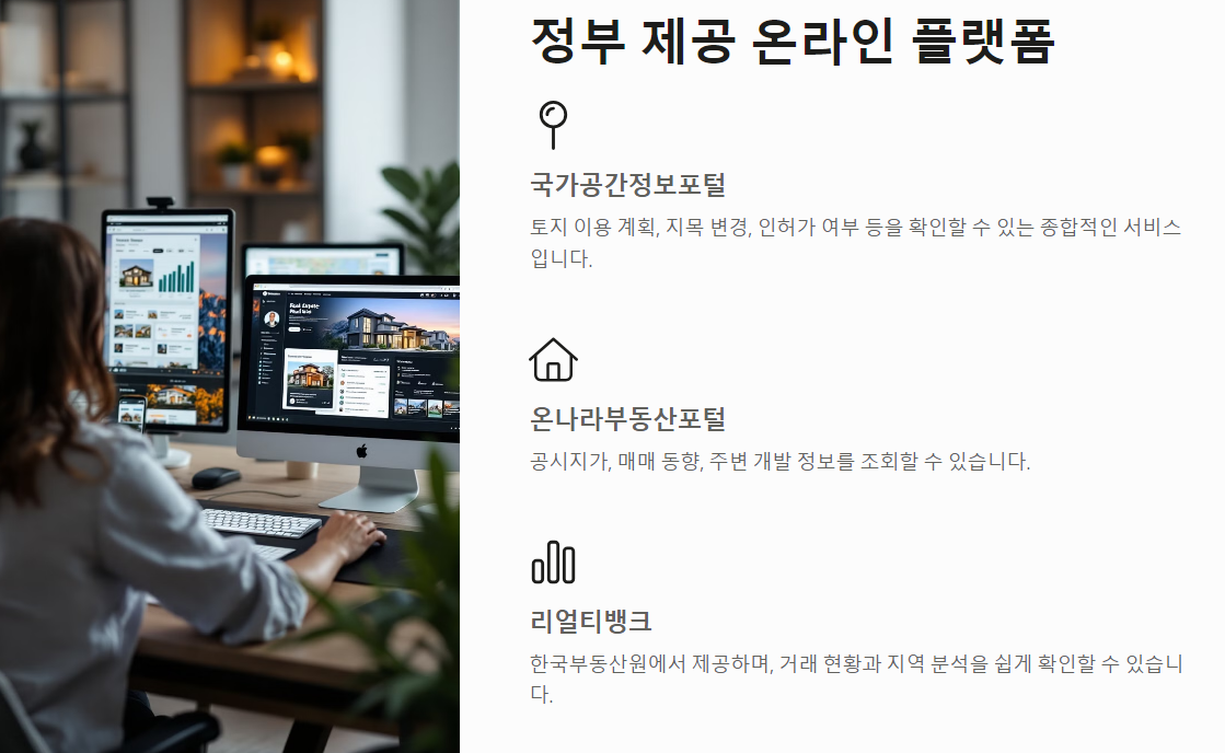 국토교통부와 지자체는 다양한 온라인 플랫폼을 통해 토지 정보를 제공합니다.