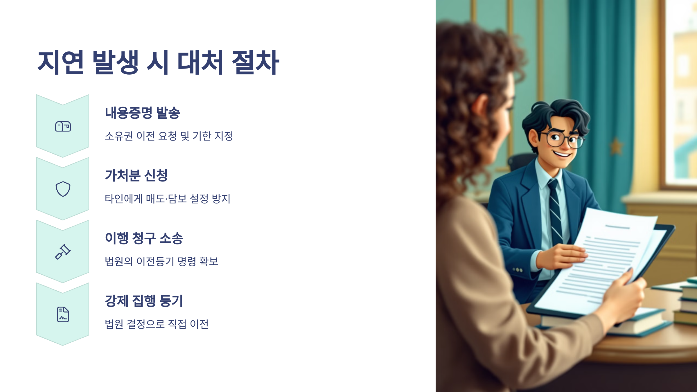법적으로는 ‘잔금 지급’만으로는 소유권이 넘어가지 않기 때문에, 등기 완료 전까지는 항상 긴장을 늦추면 안 돼요. 그럼 다음은, 실제로 소유권 이전 지연이 발생했을 때 어떤 절차로 대처해야 하는지 알려드릴게요! 📝