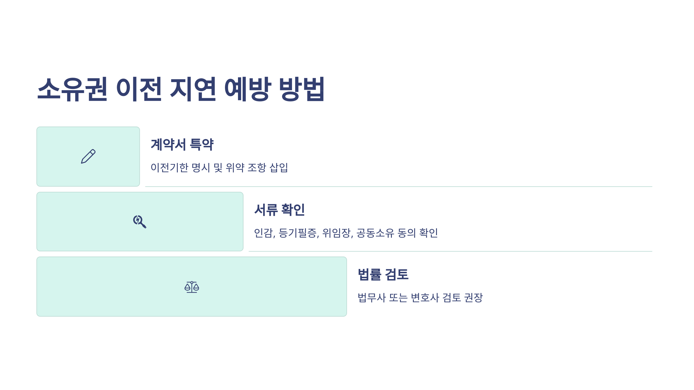 소유권 이전 지연은 한 번 발생하면 매우 피곤하고 시간도 오래 걸려요. 그래서 가장 좋은 해결책은 '애초에 지연이 발생하지 않도록 예방'하는 것이에요. 계약 단계에서부터 꼼꼼하게 준비하면 문제 발생 가능성을 확실히 줄일 수 있어요. ✅
