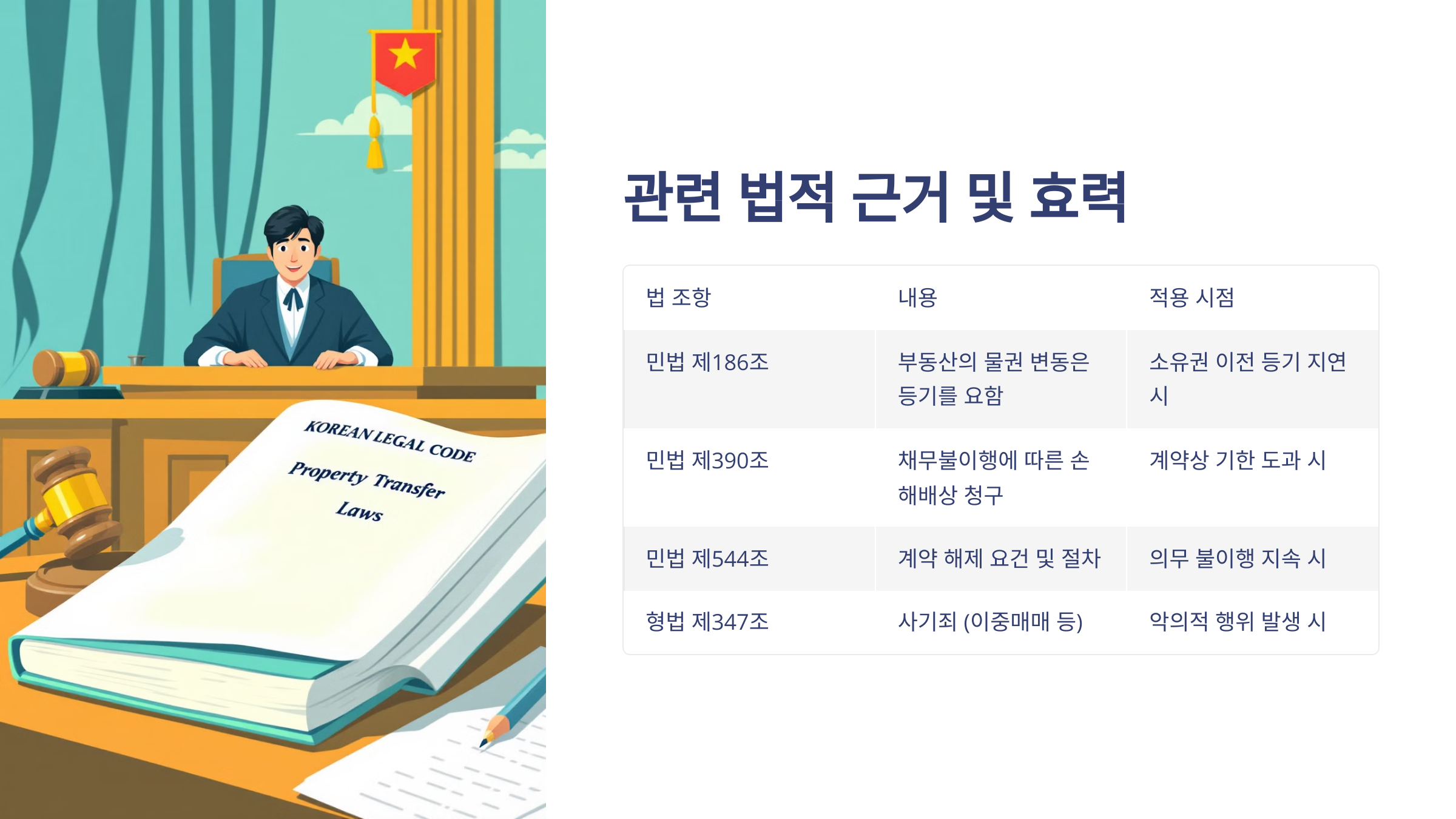 아래 표는 소유권 이전과 관련된 대표적인 법 조항들을 정리한 거예요. 지연 상황이 발생했을 때 어떤 법 조항을 기준으로 판단되는지 확인해보세요! ⚖️
