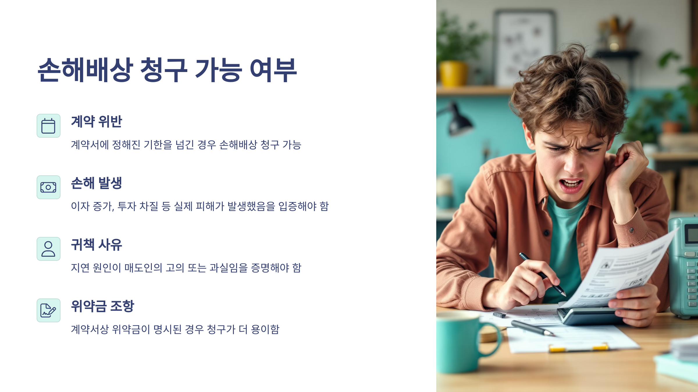 소유권 이전이 지연되면서 금전적 손해가 발생했다면, 매수인은 매도인에게 손해배상을 청구할 수 있어요. 다만, 모든 경우에 무조건 인정되는 건 아니고, 일정한 요건이 충족되어야 법적으로 배상을 받을 수 있어요.