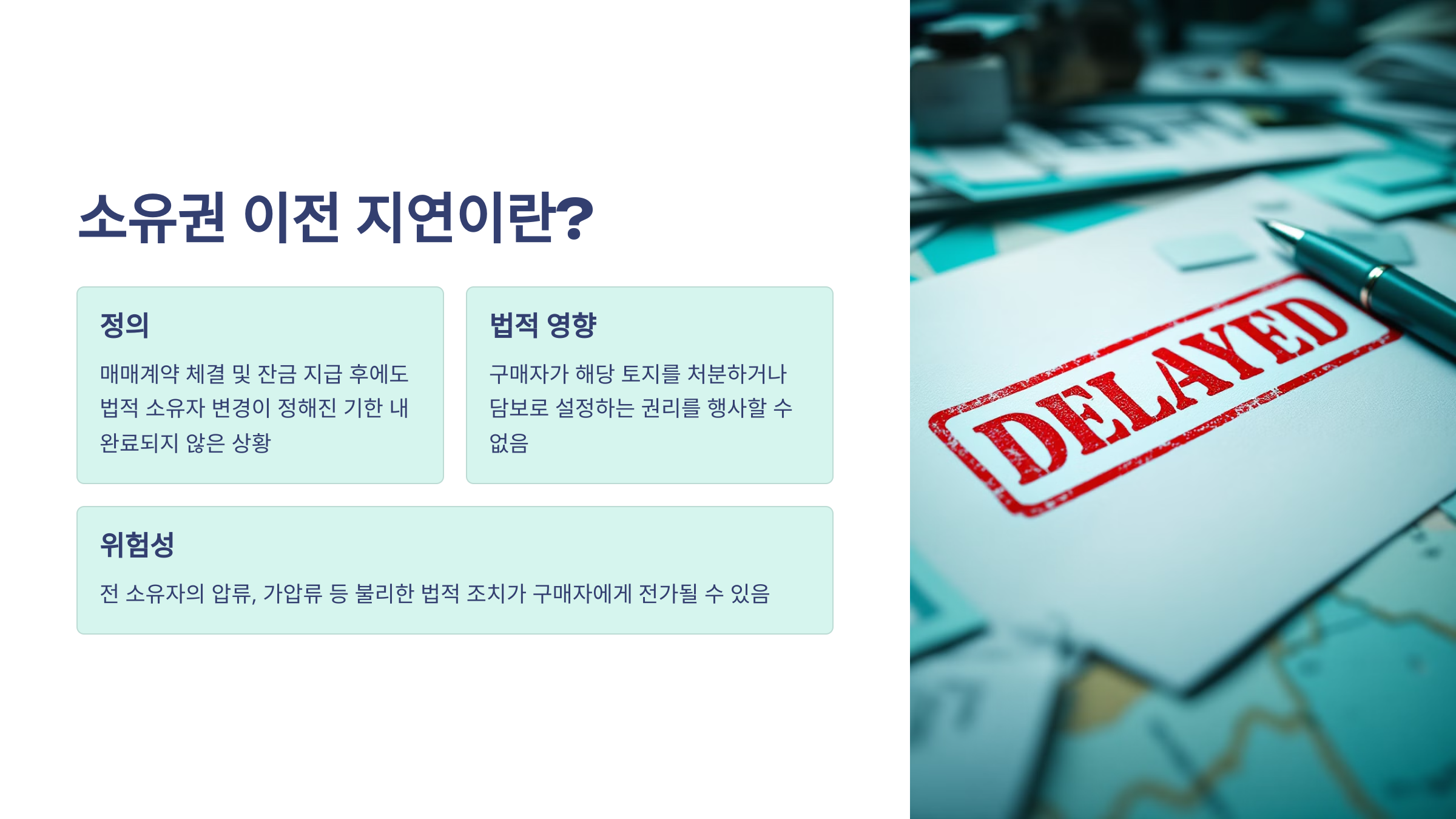 다음은 ‘소유권 이전 지연이란?’ 개념부터 시작할게요. 📘