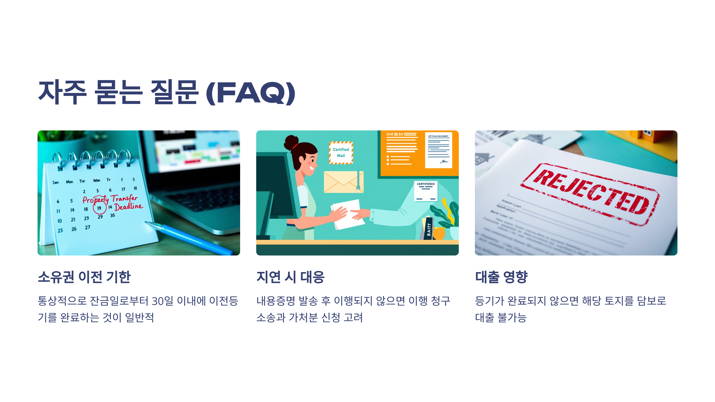 이제 소유권 이전 지연에 대해 전반적으로 다 정리됐어요! 마지막으로, 많은 분들이 궁금해하시는 실전 Q&A를 정리한 ‘FAQ’ 코너로 넘어가볼게요. ✍️